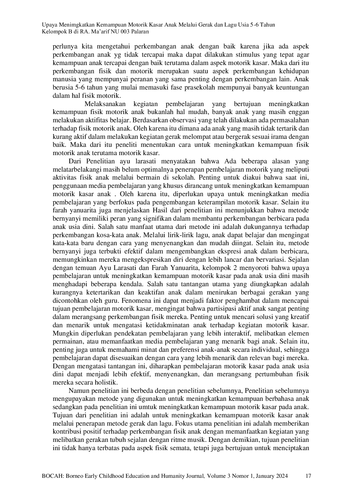 BOCAH: Borneo Early Childhood Education and Humanity JournalBOCAH: Borneo Early Childhood Education and Humanity JournalPenelitian ini merupakan Penelitian Tindakan Kelas (PTK) yang terdiri dari prasiklus dan siklus I di RA Al-Islamiyah Al-Khalidiyah Samarinda dengan subjek 15 anak Kelompok B. Penelitian ini melibatkan tahapan perencanaan, pelaksanaan, observasi, dan refleksi. Hasil penelitian menunjukkan peningkatan sebesar 5% pada presentase 72% di prasiklus menjadi 77% di siklus I. Kesimpulannya, permainan meronce dapat meningkatkan konsentrasi pada anak. Selanjutnya, penelitian membahas relevansi dan pentingnya perkembangan motorik pada anak usia dini, dengan fokus pada aspek motorik kasar dan halus. Pembelajaran gerak dan lagu disoroti sebagai metode yang efektif untuk meningkatkan keterampilan motorik kasar anak. Dalam implementasinya, guru berperan penting dalam memberikan stimulus dan pembelajaran yang sesuai dengan perkembangan anak, khususnya dalam konteks gerak dan lagu.
