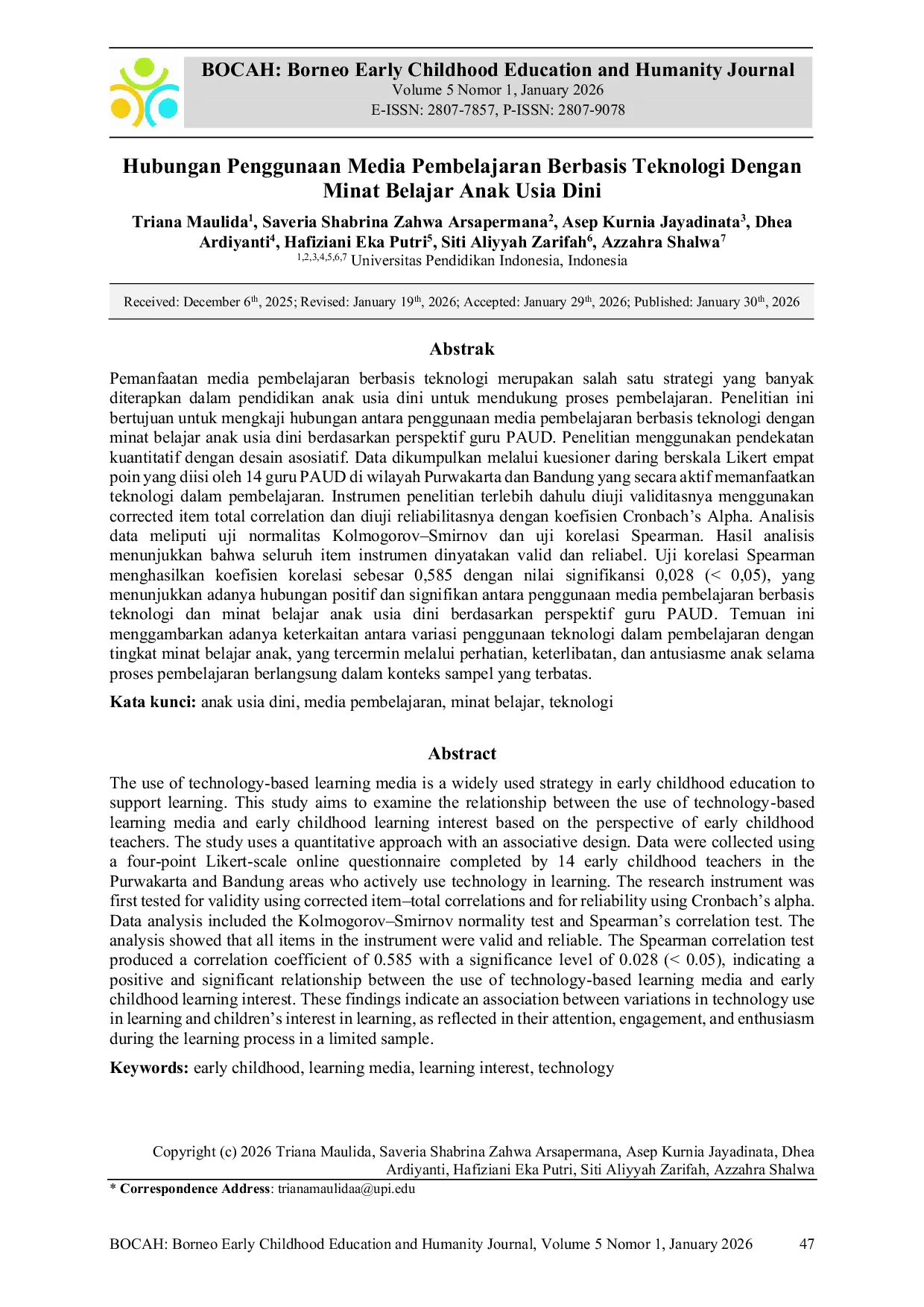 BOCAH: Borneo Early Childhood Education and Humanity JournalBOCAH: Borneo Early Childhood Education and Humanity JournalPemanfaatan media pembelajaran berbasis teknologi merupakan salah satu strategi yang banyak diterapkan dalam pendidikan anak usia dini untuk mendukung proses pembelajaran. Penelitian ini bertujuan untuk mengkaji hubungan antara penggunaan media pembelajaran berbasis teknologi dengan minat belajar anak usia dini berdasarkan perspektif guru PAUD. Penelitian menggunakan pendekatan kuantitatif dengan desain asosiatif. Data dikumpulkan melalui kuesioner daring berskala Likert empat poin yang diisi oleh 14 guru PAUD di wilayah Purwakarta dan Bandung yang secara aktif memanfaatkan teknologi dalam pembelajaran. Instrumen penelitian terlebih dahulu diuji validitasnya menggunakan corrected item total correlation dan diuji reliabilitasnya dengan koefisien Cronbachs Alpha. Analisis data meliputi uji normalitas Kolmogorov–Smirnov dan uji korelasi Spearman. Hasil analisis menunjukkan bahwa seluruh item instrumen dinyatakan valid dan reliabel. Uji korelasi Spearman menghasilkan koefisien korelasi sebesar 0,585 dengan nilai signifikansi 0,028 (< 0,05), yang menunjukkan adanya hubungan positif dan signifikan antara penggunaan media pembelajaran berbasis teknologi dan minat belajar anak usia dini berdasarkan perspektif guru PAUD. Temuan ini menggambarkan adanya keterkaitan antara variasi penggunaan teknologi dalam pembelajaran dengan tingkat minat belajar anak, yang tercermin melalui perhatian, keterlibatan, dan antusiasme anak selama proses pembelajaran berlangsung dalam konteks sampel yang terbatas.