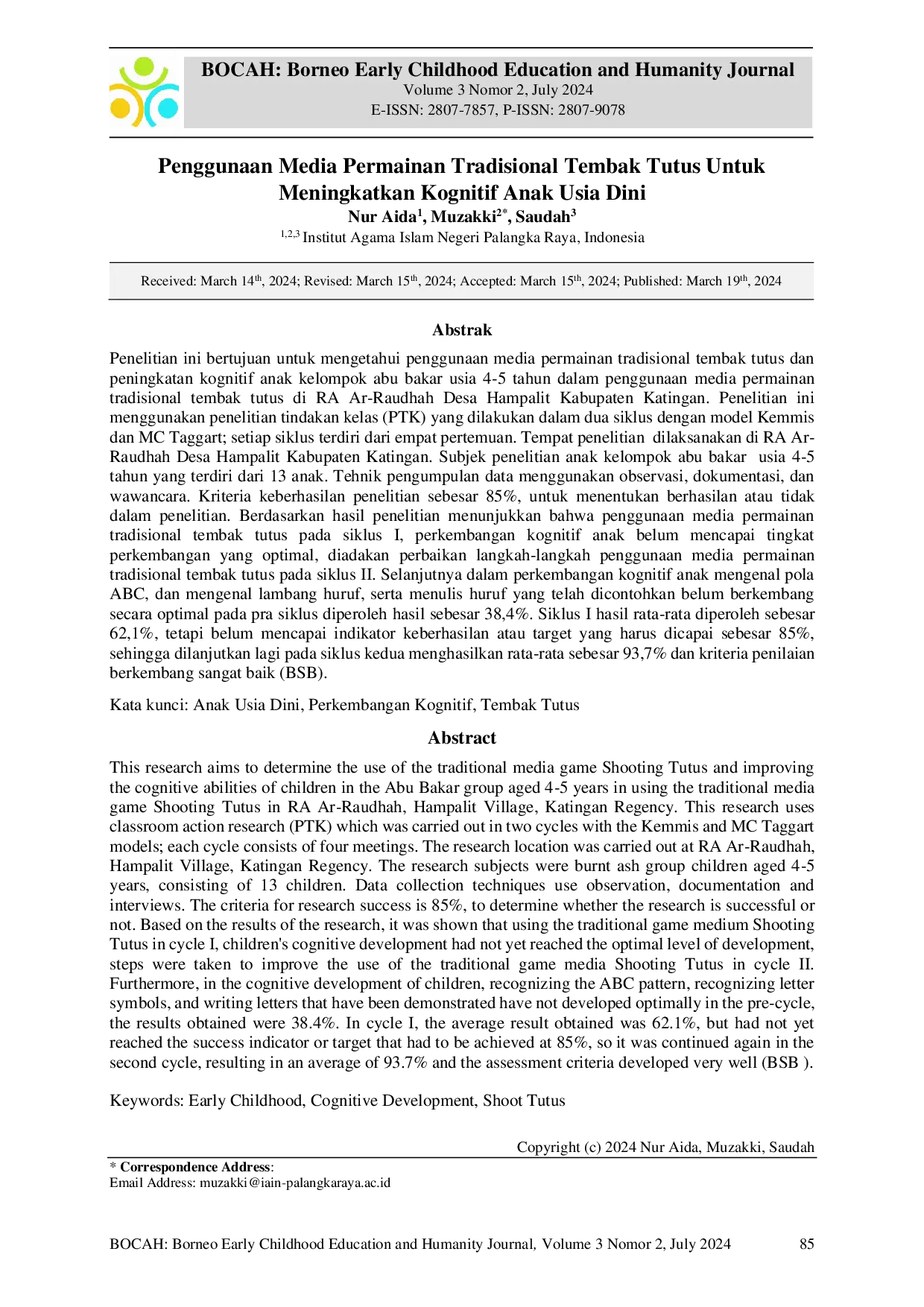 BOCAH: Borneo Early Childhood Education and Humanity JournalBOCAH: Borneo Early Childhood Education and Humanity JournalPenelitian ini bertujuan untuk mengetahui penggunaan media permainan tradisional tembak tutus dan peningkatan kognitif anak kelompok abu bakar usia 4-5 tahun dalam penggunaan media permainan tradisional tembak tutus di RA Ar-Raudhah Desa Hampalit Kabupaten Katingan. Penelitian ini menggunakan penelitian tindakan kelas (PTK) yang dilakukan dalam dua siklus dengan model Kemmis dan MC Taggart; setiap siklus terdiri dari empat pertemuan. Tempat penelitian dilaksanakan di RA Ar-Raudhah Desa Hampalit Kabupaten Katingan. Subjek penelitian anak kelompok abu bakar usia 4-5 tahun yang terdiri dari 13 anak. Tehnik pengumpulan data menggunakan observasi, dokumentasi, dan wawancara. Kriteria keberhasilan penelitian sebesar 85%, untuk menentukan keberhasilan atau tidak dalam penelitian. Berdasarkan hasil penelitian menunjukkan bahwa penggunaan media permainan tradisional tembak tutus pada siklus I, perkembangan kognitif anak belum mencapai tingkat perkembangan yang optimal, diadakan perbaikan langkah-langkah penggunaan media permainan tradisional tembak tutus pada siklus II. Selanjutnya dalam perkembangan kognitif anak mengenal pola ABC, dan mengenal lambang huruf, serta menulis huruf yang telah dicontohkan belum berkembang secara optimal pada pra siklus diperoleh hasil sebesar 38,4%. Siklus I hasil rata-rata diperoleh sebesar 62,1%, tetapi belum mencapai indikator keberhasilan atau target yang harus dicapai sebesar 85%, sehingga dilanjutkan lagi pada siklus kedua menghasilkan rata-rata sebesar 93,7% dan kriteria penilaian berkembang sangat baik (BSB).