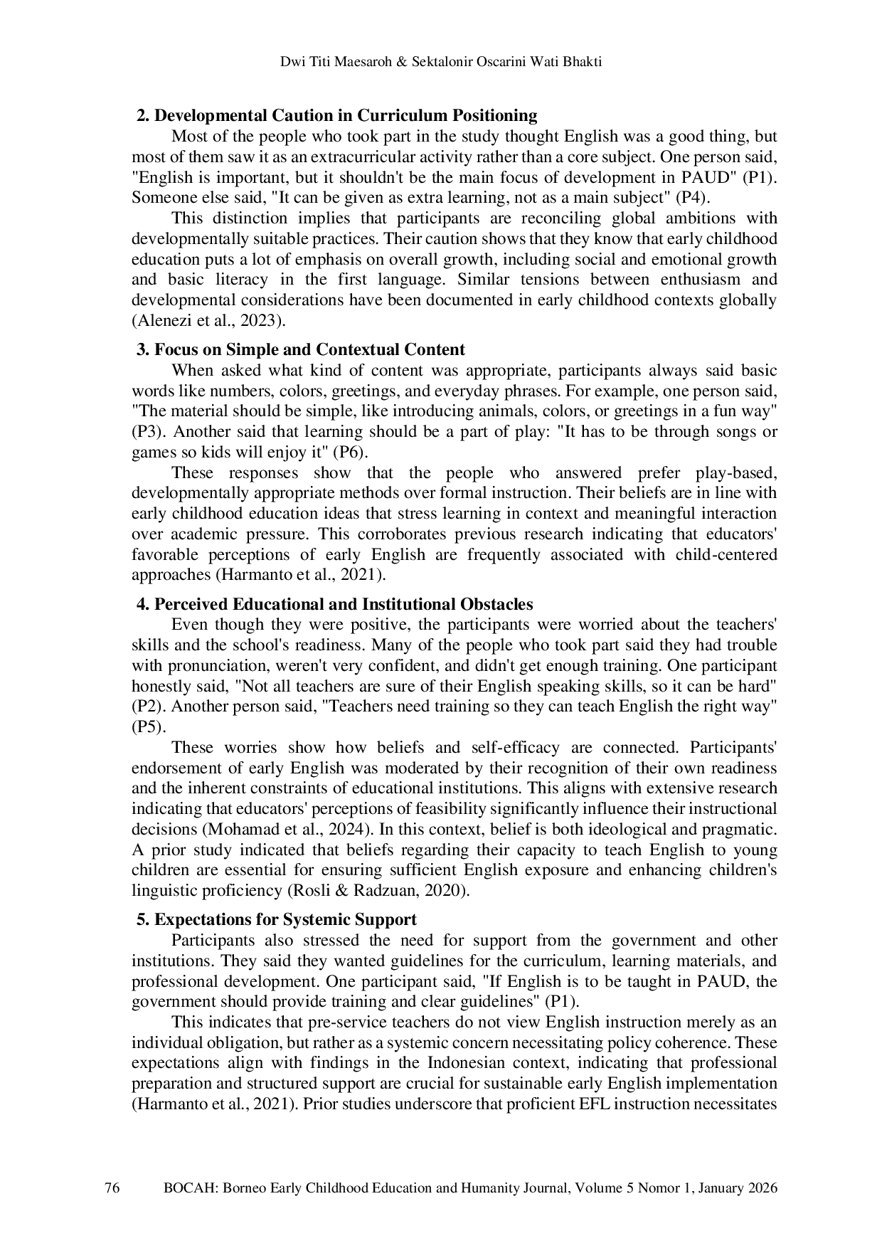BOCAH: Borneo Early Childhood Education and Humanity JournalBOCAH: Borneo Early Childhood Education and Humanity JournalPenelitian ini menelaah keyakinan mahasiswa calon guru Pendidikan Anak Usia Dini (PAUD) di Indonesia terkait integrasi bahasa Inggris dalam lingkungan pendidikan anak usia dini. Seiring meningkatnya peran bahasa Inggris secara global, muncul pertanyaan mengenai posisi bahasa Inggris dalam pembelajaran awal serta kesiapan calon guru mengajarkannya. Dengan pendekatan kualitatif deskriptif, data dikumpulkan dari enam calon guru melalui kuesioner dengan pertanyaan terbuka dan tertutup, kemudian dianalisis secara tematik. Hasil penelitian menunjukkan bahwa sebagian besar partisipan memandang bahasa Inggris penting untuk membangun kompetensi komunikasi anak di masa depan dan mendukung keterlibatan dalam konteks global. Namun, mereka juga menunjukkan kehati-hatian: mayoritas menilai bahasa Inggris lebih tepat ditempatkan sebagai kegiatan ekstrakurikuler, bukan bagian inti kurikulum, demi mengutamakan kesesuaian dengan tahap perkembangan anak. Partisipan menekankan perlunya materi yang sederhana dan kontekstual, terutama kosakata dasar, serta strategi pembelajaran yang menyenangkan. Di sisi lain, mereka mengungkap kekhawatiran tentang kemampuan guru, ketepatan pelafalan, dan terbatasnya dukungan sekolah. Temuan ini mengindikasikan bahwa calon guru cenderung positif terhadap pengajaran bahasa Inggris sejak dini, tetapi tetap menyadari tantangan pedagogis dan praktis. Oleh karena itu, program pendidikan guru perlu diperkuat, disertai panduan kebijakan yang lebih jelas agar pembelajaran bahasa Inggris dapat diterapkan secara tepat perkembangan dalam setting PAUD Indonesia.