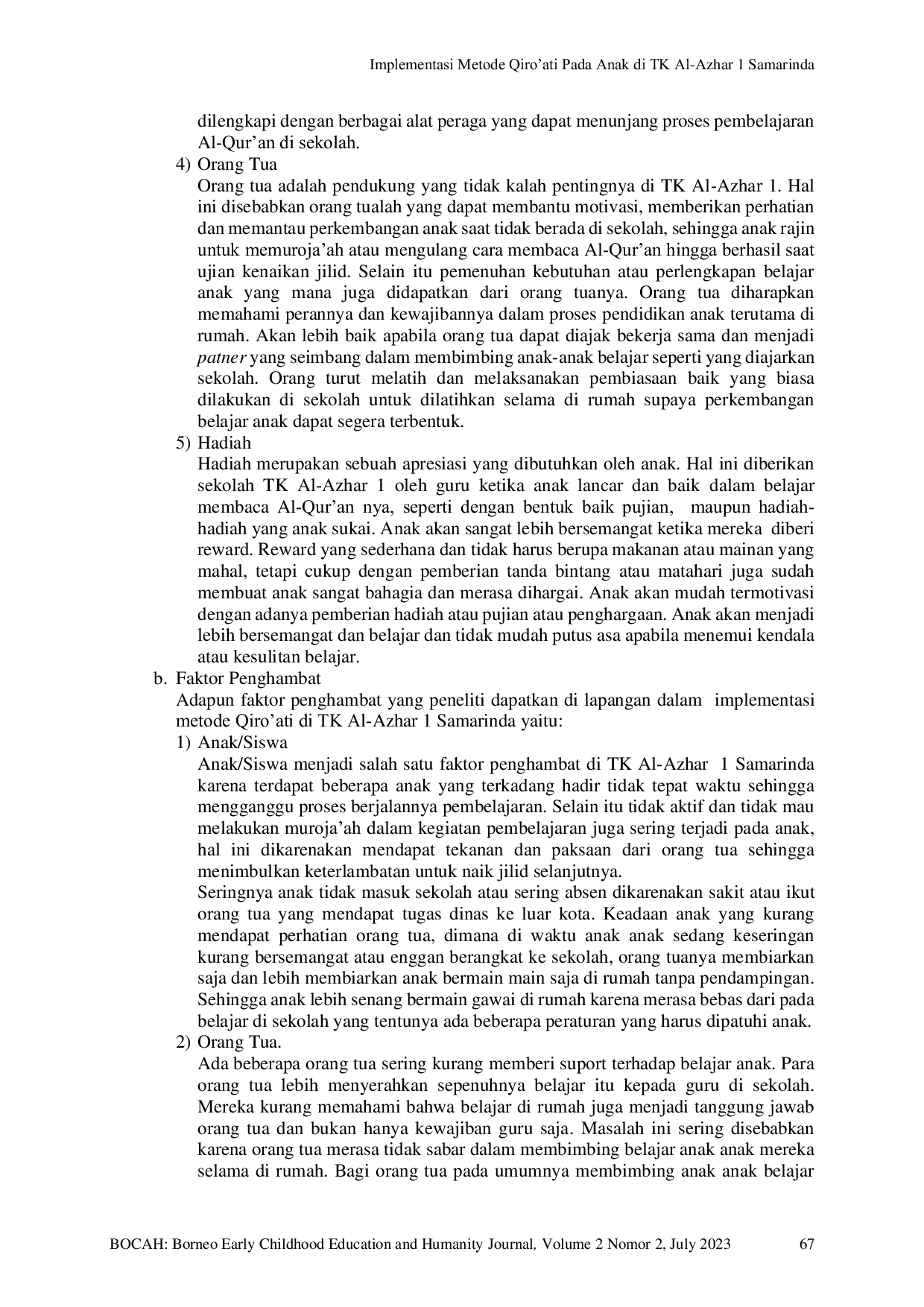 BOCAH: Borneo Early Childhood Education and Humanity JournalBOCAH: Borneo Early Childhood Education and Humanity JournalMetode dalam belajar membaca Al-Quran merupakan cara atau teknik yang diterapkan pada proses pembelajaran agar tercapai tujuan yang diinginkan yakni dapat lancar, baik dan benar ketika membaca Al-Quran. Metode Qiroati ialah teknik yang dilakukan dengan cara langsung memasukkan dan mempraktikkan bacaan Al-Quran secara tartil sesuai dengan hukum dalam ilmu tajwid. Ini adalah penelitian kualitatif. Oleh karena itu pendekatan yang digunakan dalam penelitian ini adalah penelitian lapangan. Subjek sebagai sumber data dalam penelitian ini adalah guru dan kepala sekolah TK Al-Azhar 1 Samarinda. Pengumpulan data dilakukan dengan observasi partisipatif, wawancara, dan dokumentasi. Teknik analisis data dilakukan dengan reduksi data, display data, penarikan kesimpulan data dan verifikasi. Program yang diterapkan saat pembelajaran Qiroati yakni klasikal individual. Adapun faktor pendukung pada penerapan metode Qiroati di TK Al-Azhar 1 yaitu: guru yang sudah profesional, waktu belajar yang cukup, sarana lengkap dan prasarana yang menunjang, orang tua yang mendukung serta hadiah sebagai apresiasi.