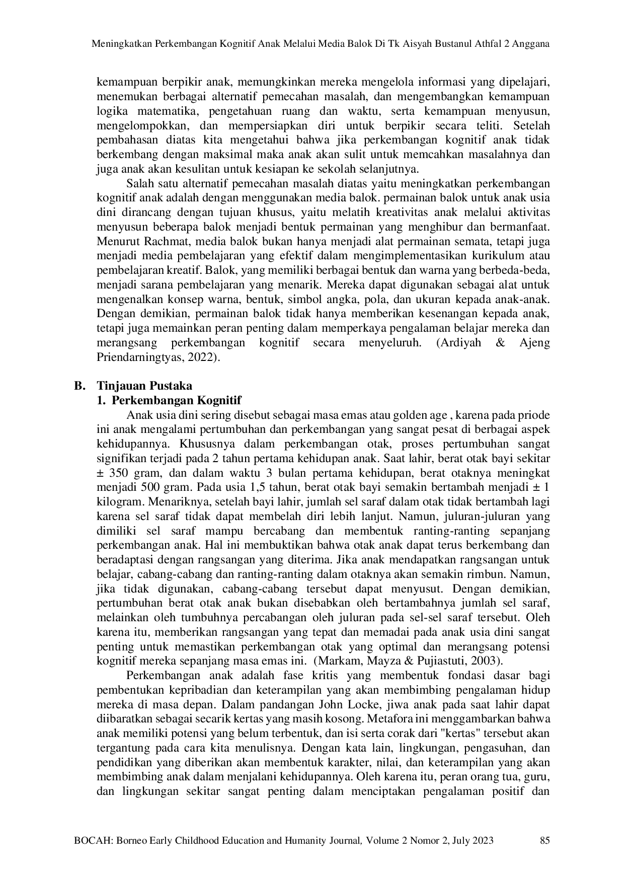 Perkembangan kognitif pada anak usia dini memiliki peran penting dalam membentuk dasar kemampuan berfikir dan pemecahan masalah yang lebih kompleks di masa depan.Salah satu metode yang terbukti efektif dalam meningkatkan perkembangan kognitif anak adalah melalui media balok.Di tk aisyiah bustanul atfhal 2 anggana, menggunakan media balok telah memberikan kontribusi yang signifikan dengan peningkatan sebesar 89 % dalam kemampuan kognitif anak.Hasil penelitian menunjukkan bahwa media balok memungkinkan anak-anak untuk mengembangkan keterampilan memecahkan masalah, mengelompokkan jumlah balok, dan mengenali ukuran balok sesuai dengan klasifikasinya.Dengan melalui media balok anak-anak dapat lebih efektif mengasah kemampuan kognitif mereka, memperoleh keahlian dalam mengatasi tantangan, dan mengembangkan fondasi yang kokoh untuk pembelajaran yang lebih lanjut.
