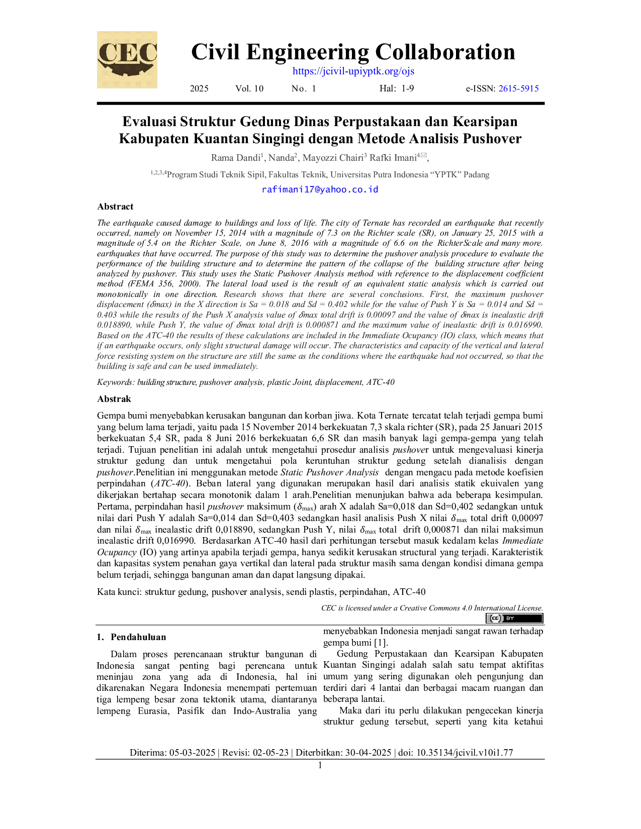 Civil Engineering CollaborationCivil Engineering CollaborationGempa bumi menyebabkan kerusakan bangunan dan korban jiwa. Kota Ternate tercatat telah terjadi gempa bumi yang belum lama terjadi, yaitu pada 15 November 2014 berkekuatan 7,3 skala richter (SR), pada 25 Januari 2015 berkekuatan 5,4 SR, pada 8 Juni 2016 berkekuatan 6,6 SR dan masih banyak lagi gempa-gempa yang telah terjadi. Tujuan penelitian ini adalah untuk mengetahui prosedur analisis pushover untuk mengevaluasi kinerja struktur gedung dan untuk mengetahui pola keruntuhan struktur gedung setelah dianalisis dengan pushover. Penelitian ini menggunakan metode Static Pushover Analysis dengan mengacu pada metode koefisien perpindahan (ATC-40). Beban lateral yang digunakan merupakan hasil dari analisis statik ekuivalen yang dikerjakan bertahap secara monotonik dalam 1 arah. Penelitian menunjukan bahwa ada beberapa kesimpulan. Pertama, perpindahan hasil pushover maksimum (𝛿max) arah X adalah Sa=0,018 dan Sd=0,402 sedangkan untuk nilai dari Push Y adalah Sa=0,014 dan Sd=0,403 sedangkan hasil analisis Push X nilai 𝛿max total drift 0,00097 dan nilai 𝛿max inealastic drift 0,018890, sedangkan Push Y, nilai 𝛿max total drift 0,000871 dan nilai maksimun inealastic drift 0,016990. Berdasarkan ATC-40 hasil dari perhitungan tersebut masuk kedalam kelas Immediate Occupancy (IO) yang artinya apabila terjadi gempa, hanya sedikit kerusakan structural yang terjadi. Karakteristik dan kapasitas system penahan gaya vertikal dan lateral pada struktur masih sama dengan kondisi dimana gempa belum terjadi, sehingga bangunan aman dan dapat langsung dipakai.