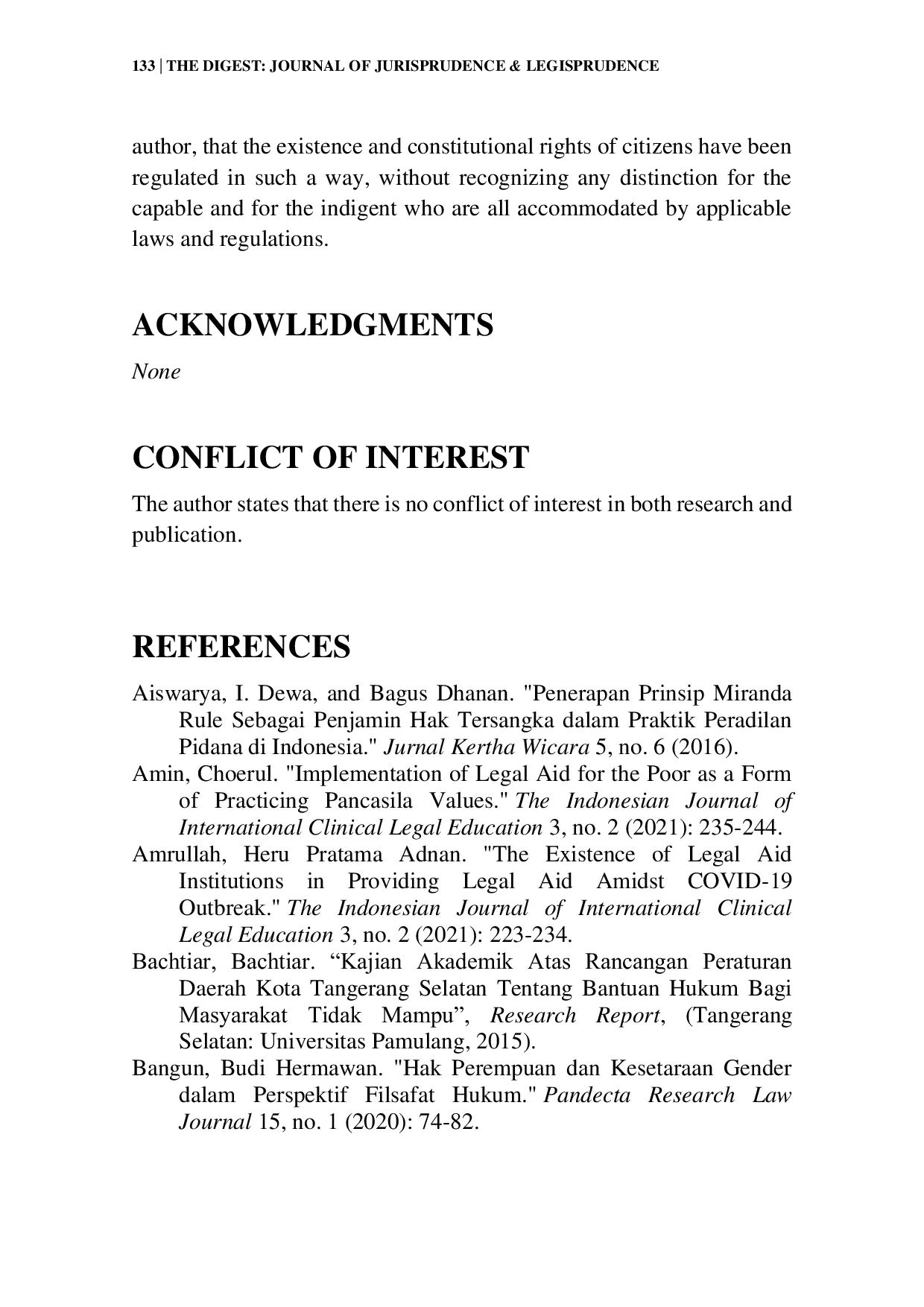 The Digest: Journal of Jurisprudence and LegisprudenceThe Digest: Journal of Jurisprudence and LegisprudenceTulisan ini mengkaji penerapan dan dampak dari Aturan Miranda dalam sistem hukum Indonesia, khususnya berkaitan dengan terdakwa yang kurang mampu, dalam kerangka Undang-Undang Nomor 16 Tahun 2011. Berawal dari kelalaian penyidik selama pemeriksaan seorang warga negara Arizona, Aturan Miranda telah berkembang menjadi prinsip hukum yang krusial dalam melindungi hak-hak tersangka sebagai warga negara, dengan implikasi konstitusional. Studi ini menyelidiki penggabungan prinsip-prinsip Miranda ke dalam perundang-undangan Indonesia, dengan fokus pada relevansinya dalam memberikan bantuan hukum bagi individu yang kurang mampu yang dituduh melakukan tindak pidana. Penelitian ini melacak sejarah perkembangan Aturan Miranda, menekankan perannya yang transformatif dalam membentuk norma hukum dan melindungi hak-hak individu. Analisis dilakukan terhadap ketentuan-ketentuan khusus dalam Undang-Undang Nomor 16 Tahun 2011 yang menangani kebutuhan terdakwa yang kurang mampu, serta menjelajahi implikasi praktis dari ketentuan-ketentuan tersebut dalam skenario hukum di dunia nyata. Selain itu, makalah ini membahas konsekuensi lebih luas dari Aturan Miranda, menguji pengaruhnya pada peraturan turunan yang menentukan ulang status hukum individu dalam kerangka hukum Indonesia. Advokasi untuk terdakwa yang kurang mampu menjadi tema sentral, menekankan peran aturan ini dalam menjamin keadilan dan kesejahteraan bagi semua warga negara. Melalui analisis komprehensif terhadap teks hukum, studi kasus, dan implikasi praktis, makalah ini berkontribusi pada pemahaman tentang bagaimana Aturan Miranda, sebagaimana diatur dalam Undang-Undang Nomor 16 Tahun 2011, berinteraksi dengan hak-hak dan kesejahteraan terdakwa yang kurang mampu dalam sistem peradilan pidana Indonesia.
