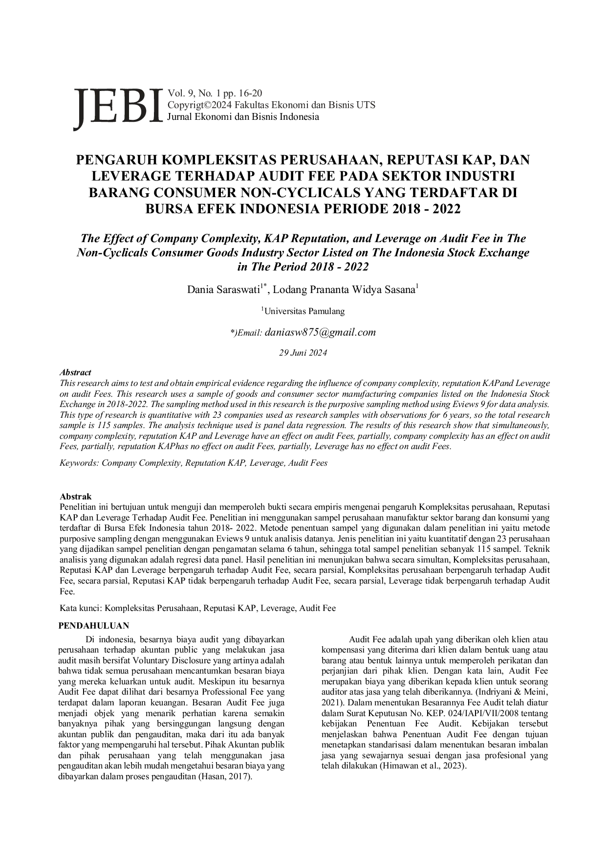 Jurnal Ekonomi dan Bisnis IndonesiaJurnal Ekonomi dan Bisnis IndonesiaPenelitian ini bertujuan untuk menguji dan memperoleh bukti secara empiris mengenai pengaruh Kompleksitas perusahaan, Reputasi KAP dan Leverage Terhadap Audit Fee. Penelitian ini menggunakan sampel perusahaan manufaktur sektor barang dan konsumi yang terdaftar di Bursa Efek Indonesia tahun 2018- 2022. Metode penentuan sampel yang digunakan dalam penelitian ini yaitu metode purposive sampling dengan menggunakan Eviews 9 untuk analisis datanya. Jenis penelitian ini yaitu kuantitatif dengan 23 perusahaan yang dijadikan sampel penelitian dengan pengamatan selama 6 tahun, sehingga total sampel penelitian sebanyak 115 sampel. Teknik analisis yang digunakan adalah regresi data panel. Hasil penelitian ini menunjukan bahwa secara simultan, Kompleksitas perusahaan, Reputasi KAP dan Leverage berpengaruh terhadap Audit Fee, secara parsial, Kompleksitas perusahaan berpengaruh terhadap Audit Fee, secara parsial, Reputasi KAP tidak berpengaruh terhadap Audit Fee, secara parsial, Leverage tidak berpengaruh terhadap Audit Fee.