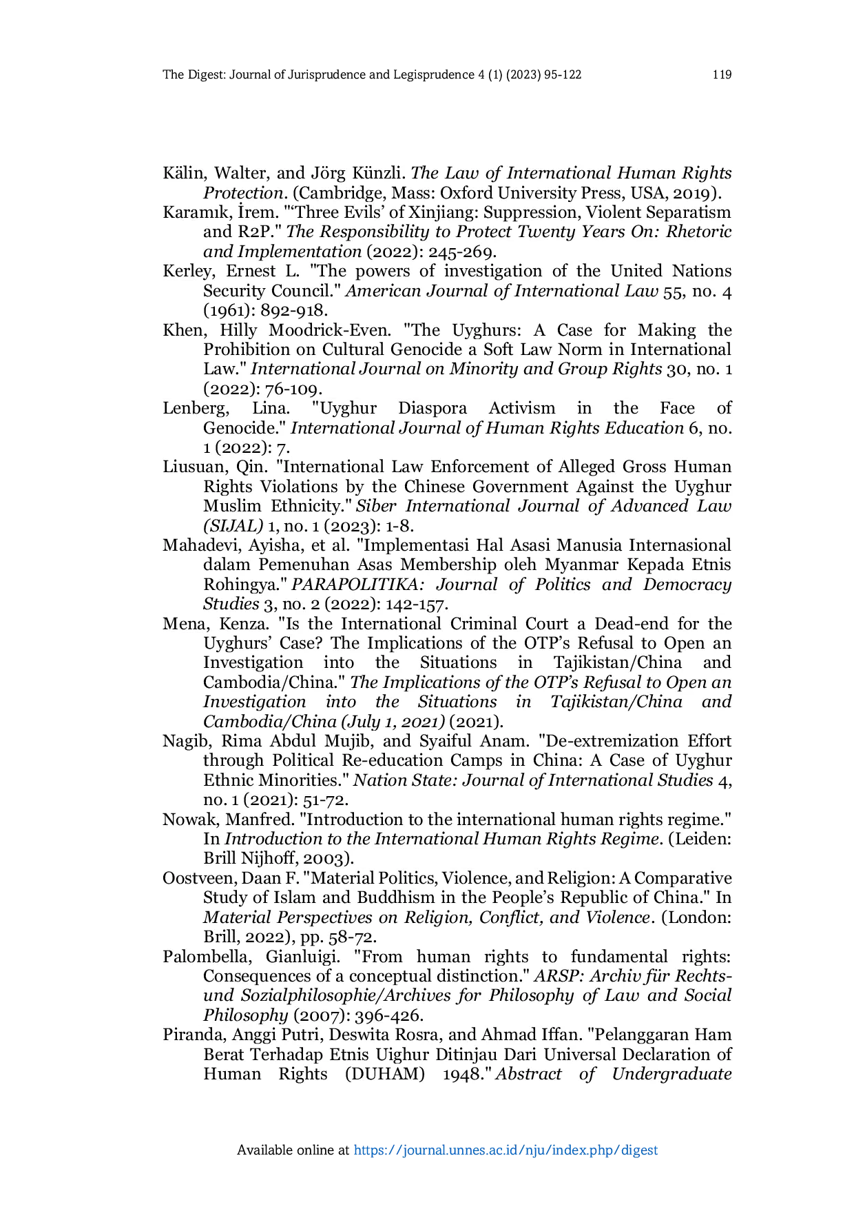 The Digest: Journal of Jurisprudence and LegisprudenceThe Digest: Journal of Jurisprudence and LegisprudenceKomunitas internasional saat ini menghadapi krisis kemanusiaan yang parah yang melibatkan populasi Uyghur di Xinjiang, China, ditandai dengan laporan yang meluas tentang pelanggaran hak asasi manusia yang keji, yang mencakup kerja paksa, asimilasi paksa, dan penahanan massal. Studi ini menekankan pentingnya Pengadilan Kriminal Internasional (ICC) untuk menegakkan yurisdiksinya dan memulai penyelidikan terhadap kejahatan terhadap kemanusiaan yang diduga dilakukan terhadap orang Uyghur. Kasus Uyghur menyajikan tantangan yang unik bagi ICC, mengingat dinamika politik yang kompleks yang mengelilingi pengaruh global China dan keanggotaannya yang tidak ada dalam Statuta Roma. Namun, studi ini berpendapat bahwa peran ICC dalam menangani pelanggaran hak asasi manusia yang serius ini sekarang lebih penting dari sebelumnya. Ini menyelidiki jalur hukum untuk yurisdiksi ICC, mengeksplorasi dasar potensial di bawah prinsip universalitas dan kemungkinan bahwa beberapa kejahatan yang diduga mungkin memenuhi syarat sebagai kejahatan perang atau kejahatan terhadap kemanusiaan. Selain itu, studi ini menyelidiki imperatif etis yang memaksa komunitas internasional untuk mengambil tindakan tegas terhadap penyalahgunaan sistemik, menegaskan bahwa keadilan dan pertanggungjawaban adalah landasan hukum internasional. Ini juga membahas hambatan dan keberatan yang dapat diprediksi terhadap yurisdiksi ICC, termasuk tantangan terkait kedaulatan negara, pertimbangan geopolitik, dan praktisnya mengejar pejabat tingkat tinggi. Kesimpulannya, studi ini menekankan urgensi ICC menegaskan yurisdiksi dalam kasus Uyghur, yang memberikan kesempatan bagi komunitas internasional untuk menunjukkan dedikasinya dalam menegakkan hak asasi manusia dan keadilan di hadapan pelanggaran serius.