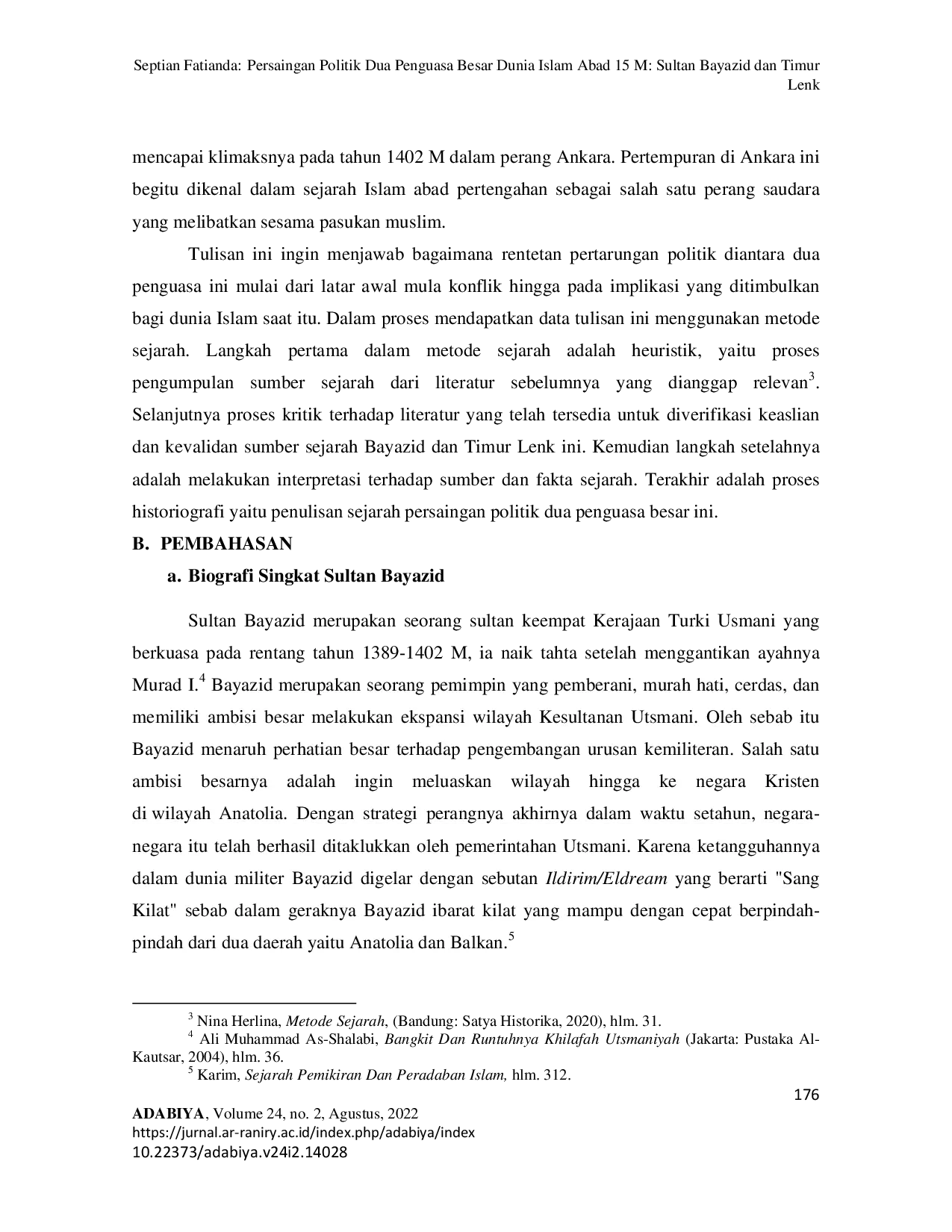 Jurnal AdabiyaJurnal AdabiyaPasca runtuhnya Dinasti Abbasiyah tahun 1258 akibat serangan bangsa Mongol, kiblat kekuasaan besar Islam mulai berpindah ke Kesultanan Ustmani dan Imperium Timuriah. Dua kekuasaan besar tersebut masing-masing dipimpin oleh Sultan Bayazid dan Timur Lenk. Perkembangan dan kekuatan yang miliki oleh kedua penguasa ini membawa pada titik dimana mereka saling bersaing dalam menyebar pengaruh politik. Kebijakan untuk saling menggrogoti wilayah pun tidak dapat terelakkan. Puncaknya mereka bertemu dalam perang besar pada tahun 1402 di Ankara. Perang tersebut akhirnya dimenangkan oleh pasukan Timur Lenk dan Sultan Bayazid menjadi tahanan perang. Tulisan menggunakan metode sejarah yang berfokus pada kajian literatur untuk menemukan sumber dan menyajikan jawaban penelitian. Tulisan ini betujuan untuk menguraikan sebab-sebab persaingan politik dan implikasinya bagi dunia Islam saat itu.