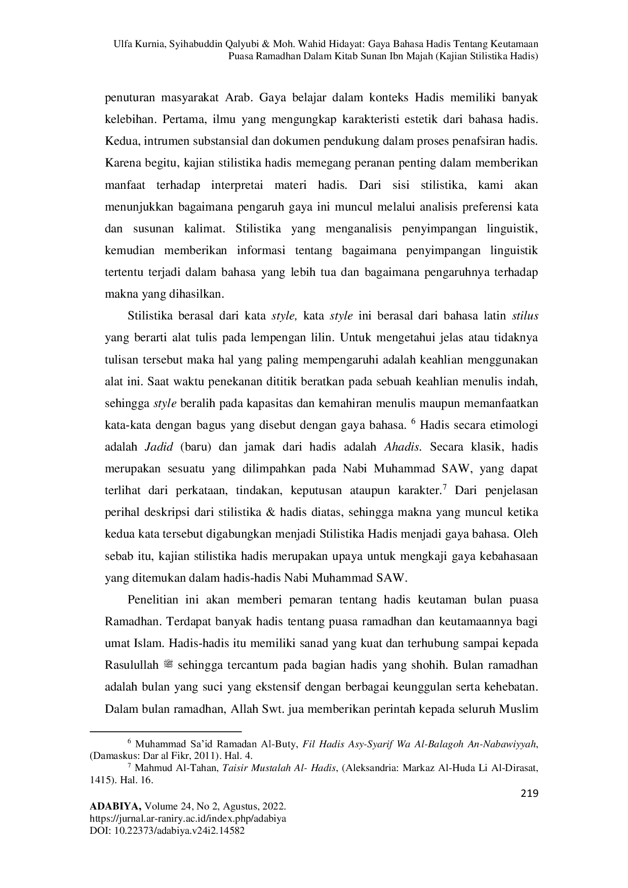 Analisis gaya bahasa pada hadis tentang keutamaan puasa Ramadhan Sunan Ibn Majah menunjukkan unsur estetika dari surat tersebut yang dilihat dari lima aspek stilistika yaitu aspek fonologi, morfologi, aspek sintaksis, aspek semantik dan aspek imagery.Pada aspek fonologi hadis-hadis diatas didominasi oleh konsonan yang berupa konsonan plosif.Terdapat dua saja dan satu bentuk jinas yaitu saja Mutharraf yaitu sajak yang dua kata akhirnya memiliki akhir yang sama tetapi dengan wazan yang berbeda, dan saja mutawaazi yang sama dari segi wazan namun berbeda dari qafiyahnya.Sedangakan jinas ialah dua lafadz (kata) yang persis sama pengucapannya namun berbeda maknanya.Dari analisis tersebut maka dapat ditarik kesimpulan bahwa gaya bahasa pada hadis tersebut memiliki bentuk keserasian fonologi yang khas yang diikuti dengan makna lawan kata dari makna yang disampaikan serta pemilihan kata yang digunakan sesuai dengan Al-Quran sehingga ketika kita membaca dan mencoba untuk memahaminya maka kita akan mudah menafsirkan maknaya serta dapat kita jadikan acuan referensi dalam pemahan ayat-ayat suci Al-Quran.