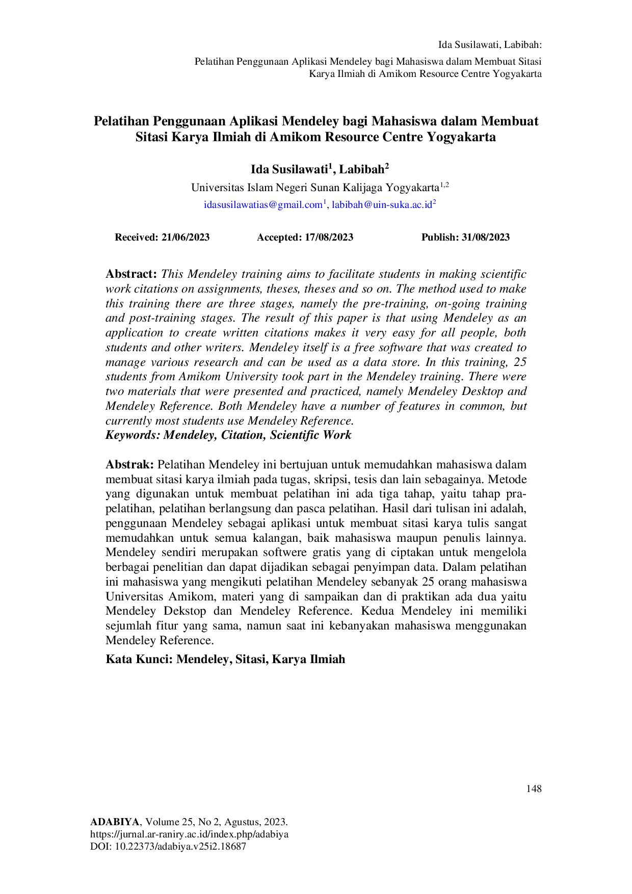 Jurnal AdabiyaJurnal AdabiyaPelatihan Mendeley ini bertujuan untuk memudahkan mahasiswa dalam membuat sitasi karya ilmiah pada tugas, skripsi, tesis dan lain sebagainya. Metode yang digunakan untuk membuat pelatihan ini ada tiga tahap, yaitu tahap pra-pelatihan, pelatihan berlangsung dan pasca pelatihan. Hasil dari tulisan ini adalah, penggunaan Mendeley sebagai aplikasi untuk membuat sitasi karya tulis sangat memudahkan untuk semua kalangan, baik mahasiswa maupun penulis lainnya. Mendeley sendiri merupakan software gratis yang diciptakan untuk mengelola berbagai penelitian dan dapat dijadikan sebagai penyimpan data. Dalam pelatihan ini mahasiswa yang mengikuti pelatihan Mendeley sebanyak 25 orang mahasiswa Universitas Amikom, materi yang disampaikan dan dipraktikkan ada dua yaitu Mendeley Desktop dan Mendeley Reference. Kedua Mendeley ini memiliki sejumlah fitur yang sama, namun saat ini kebanyakan mahasiswa menggunakan Mendeley Reference.