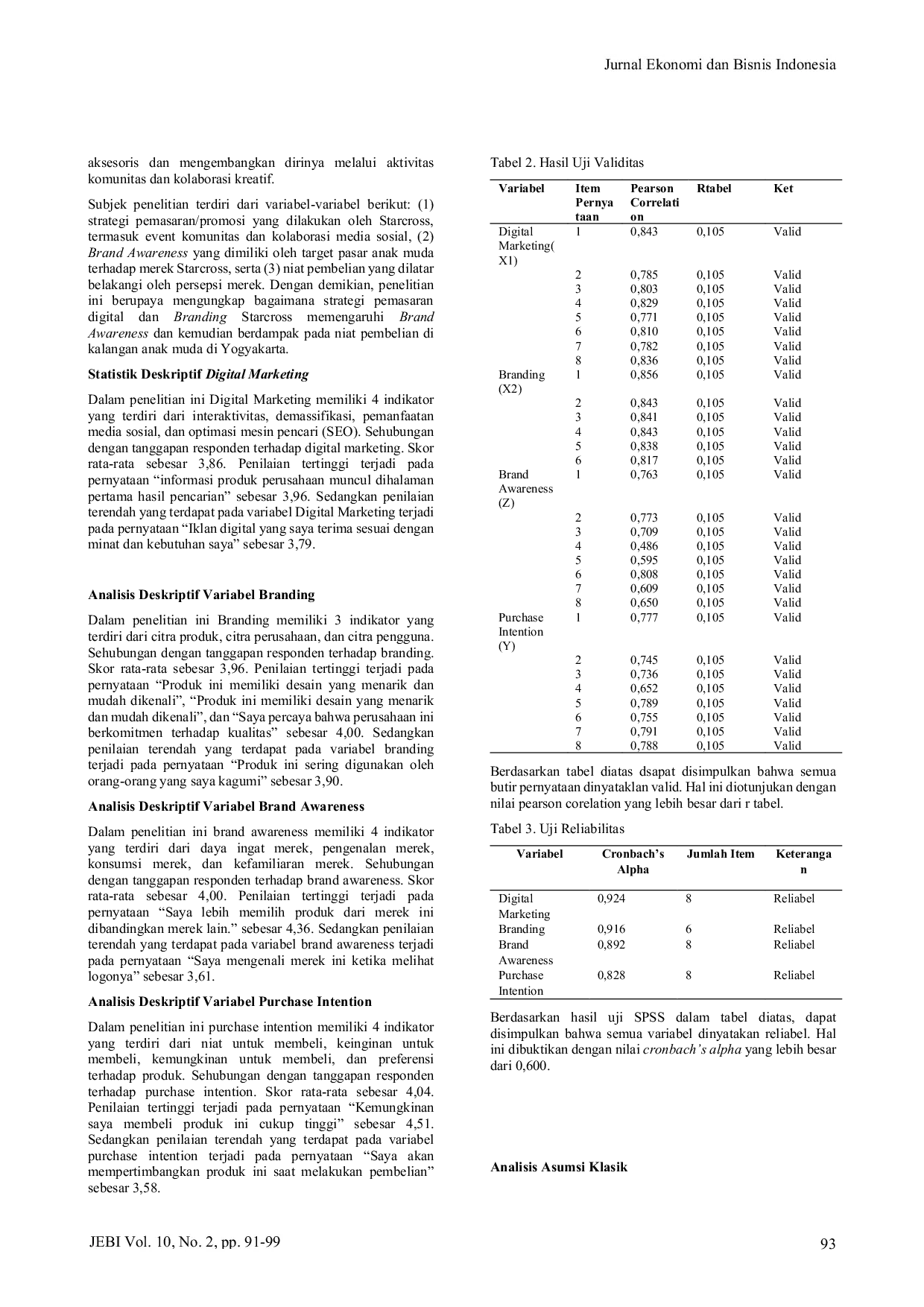 Jurnal Ekonomi dan Bisnis IndonesiaJurnal Ekonomi dan Bisnis IndonesiaPenelitian ini bertujuan untuk menganalisis peran digital marketing dan branding dalam mempengaruhi purchase intention dengan brand awareness sebagai variabel intervening pada konsumen brand Starcross di Yogyakarta. Penelitian ini menggunakan metode kuantitatif dengan data primer yang dikumpulkan melalui kuesioner berbasis skala Likert. Sampel penelitian berjumlah 105 responden yang merupakan konsumen Starcross, dengan teknik pengambilan sampel purposive sampling. Analisis data dilakukan menggunakan regresi linear berganda dan uji Sobel dengan bantuan perangkat lunak SPSS. Hasil penelitian menunjukkan bahwa digital marketing dan branding berpengaruh positif dan signifikan terhadap brand awareness. Selain itu, digital marketing, branding, dan brand awareness juga terbukti berpengaruh positif dan signifikan terhadap purchase intention. Hasil uji mediasi menunjukkan bahwa brand awareness mampu memediasi pengaruh digital marketing dan branding terhadap purchase intention. Temuan ini menegaskan pentingnya integrasi strategi digital marketing dan branding dalam meningkatkan kesadaran merek serta mendorong minat beli konsumen, khususnya pada industri fashion lokal.