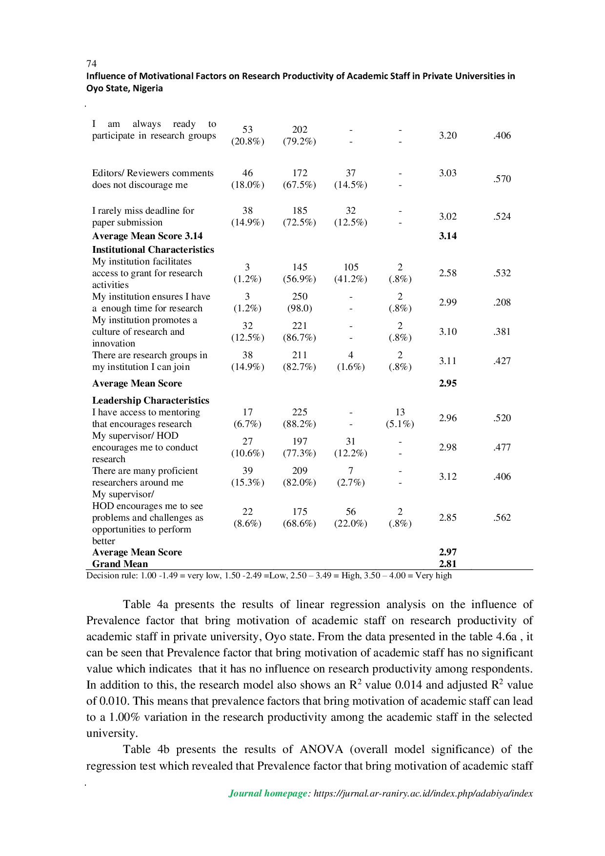 Jurnal AdabiyaJurnal AdabiyaAcademic staff members play a fundamental role in the intellectual development of institutions. This role is also reflected in the productivity level of academic staff. When academic staff are productive, it greatly contributes to the sustainability of the organization by bringing many positive impacts. Conversely, if this does not happen, there is a tendency that the organization may decline or even collapse. In this regard, this study deems it necessary to investigate motivational factors on research productivity of Academic Staff in Private Universities in Oyo State. The study used a descriptive research design of a correlational type. The population consisted of 717 academic staff in private universities in Oyo State, Nigeria. A sample size of 255 academic staff was determined using the Yamane table, while a validated questionnaire was used to collect data from the respondents. Data collected was analyzed using descriptive and inferential statistics. The results showed that motivational factors had no significant impact on research productivity (Adj. R² = 0.010; p = 0.057), while prevalent factors that bring about motivation were also found to have no statistically significant influence on Research Productivity (β = 0.165, t = 1.790; p > 0.05). The study concluded that prevalent factors that bring about motivation do not strongly influence Research Productivity. The study recommended that private universities should increase their support by facilitating access to grants for research activities of their academic staff, and academic staff should work more on their research skills.