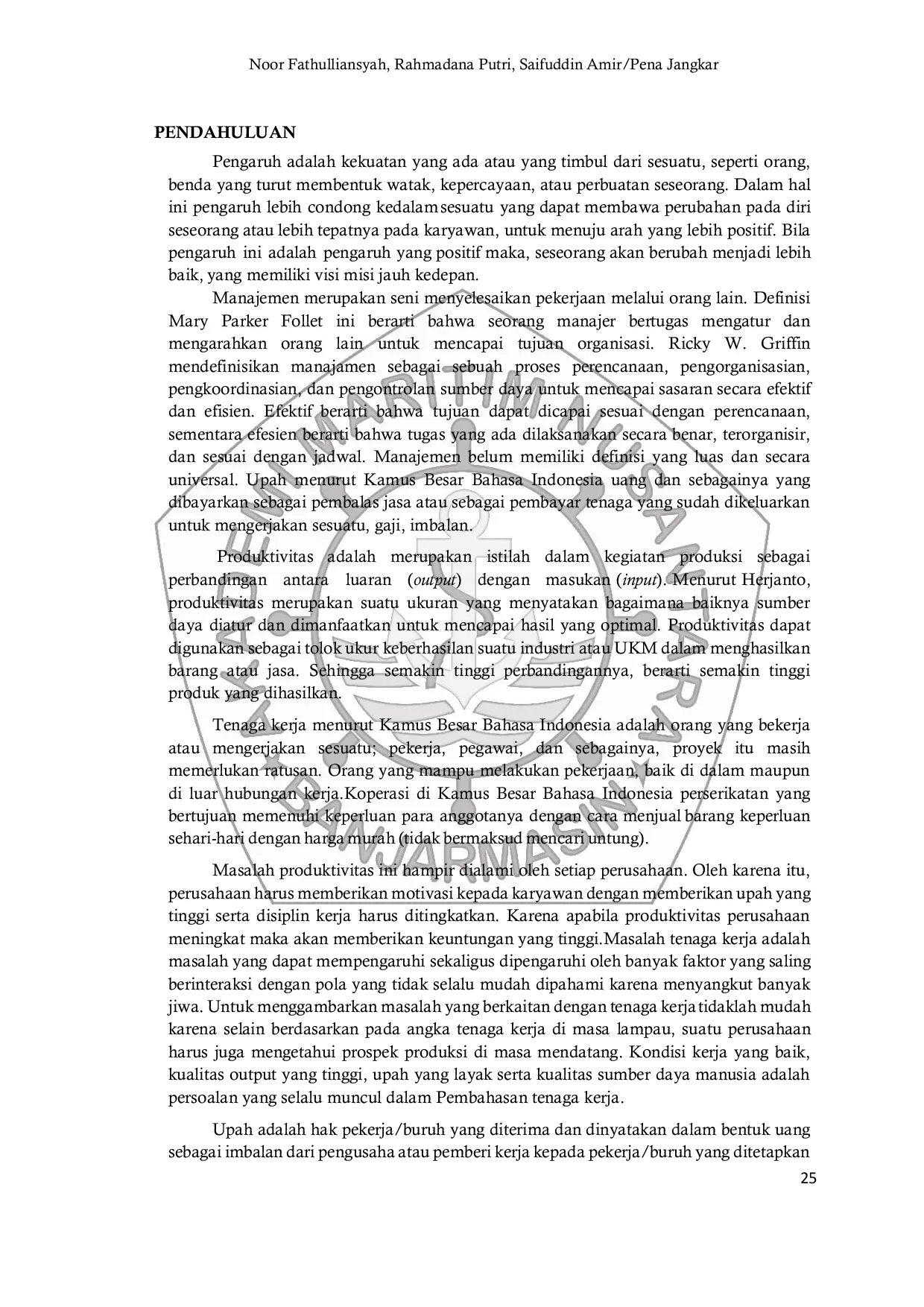 Pena JangkarPena JangkarManajemen merupakan seni menyelesaikan pekerjaan melalui orang lain. Definisi Mary Parker Follet ini berarti bahwa seorang manajer bertugas mengatur dan mengarahkan orang lain untuk mencapai tujuan organisasi. Ricky W. Griffin mendefinisikan manajemen sebagai sebuah proses perencanaan, pengorganisasian, pengkoordinasian, dan pengontrolan sumber daya untuk mencapai sasaran secara efektif dan efisien. Efektif berarti bahwa tujuan dapat dicapai sesuai dengan perencanaan, sementara efisien berarti bahwa tugas yang ada dilaksanakan secara benar, terorganisir, dan sesuai dengan jadwal. Manajemen belum memiliki definisi yang luas dan secara universal. Upah menurut Kamus Besar Bahasa Indonesia adalah uang dan sebagainya yang dibayarkan sebagai pembalas jasa atau sebagai pembayar tenaga yang sudah dikeluarkan untuk mengerjakan sesuatu, gaji, imbalan. Penelitian ini menggunakan metode kualitatif dengan pendekatan kualitatif. Sumber data penelitian berlokasi di kantor Koperasi TKBM Samudera Nusantara Banjarmasin. Data penelitian dikumpulkan melalui observasi, wawancara, dan data dokumentasi. Sistem pengupahan tenaga kerja pada koperasi TKBM Samudera Nusantara Banjarmasin dilakukan dengan sistem upah borongan. Upah minimum TKBM dihitung minimal sama dengan upah minimum provinsi (UMP) atau upah minimum kabupaten/kota. Upah bongkar muat, sebagai faktor produktivitas tenaga kerja, menunjukkan bahwa semakin baik manajemen upah, semakin meningkat produktivitas tenaga kerja.