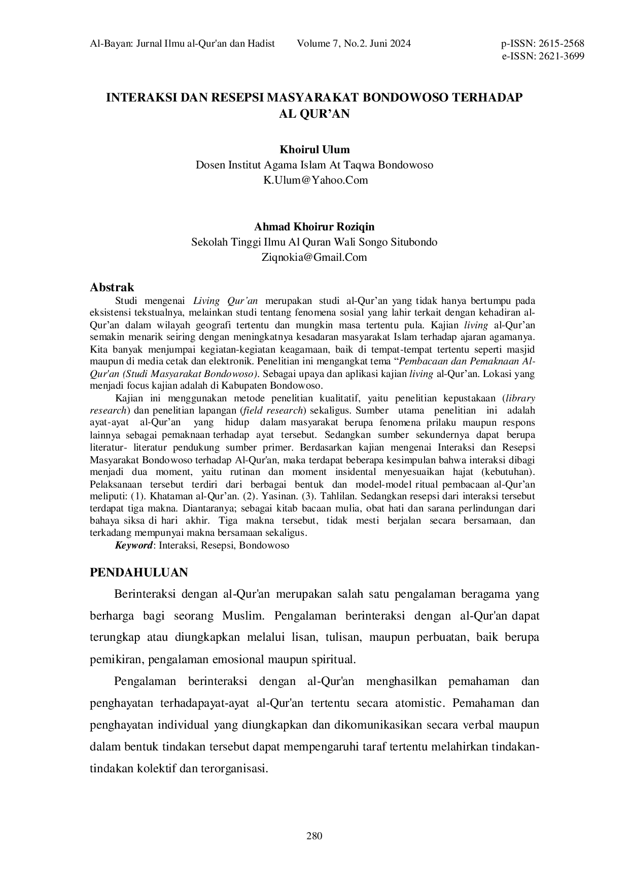 ALBAYANALBAYANStudi mengenai Living Quran merupakan studi al-Quran yang tidak hanya bertumpu pada eksistensi tekstualnya, melainkan studi tentang fenomena sosial yang lahir terkait dengan kehadiran al-Quran dalam wilayah geografi tertentu dan mungkin masa tertentu pula. Kajian living al-Quran semakin menarik seiring dengan meningkatnya kesadaran masyarakat Islam terhadap ajaran agamanya. Kita banyak menjumpai kegiatan-kegiatan keagamaan, baik di tempat-tempat tertentu seperti masjid maupun di media cetak dan elektronik. Penelitian ini mengangkat tema “Pembacaan dan Pemaknaan Al-Quran (Studi Masyarakat Bondowoso). Sebagai upaya dan aplikasi kajian living al-Quran. Lokasi yang menjadi focus kajian adalah di Kabupaten Bondowoso.