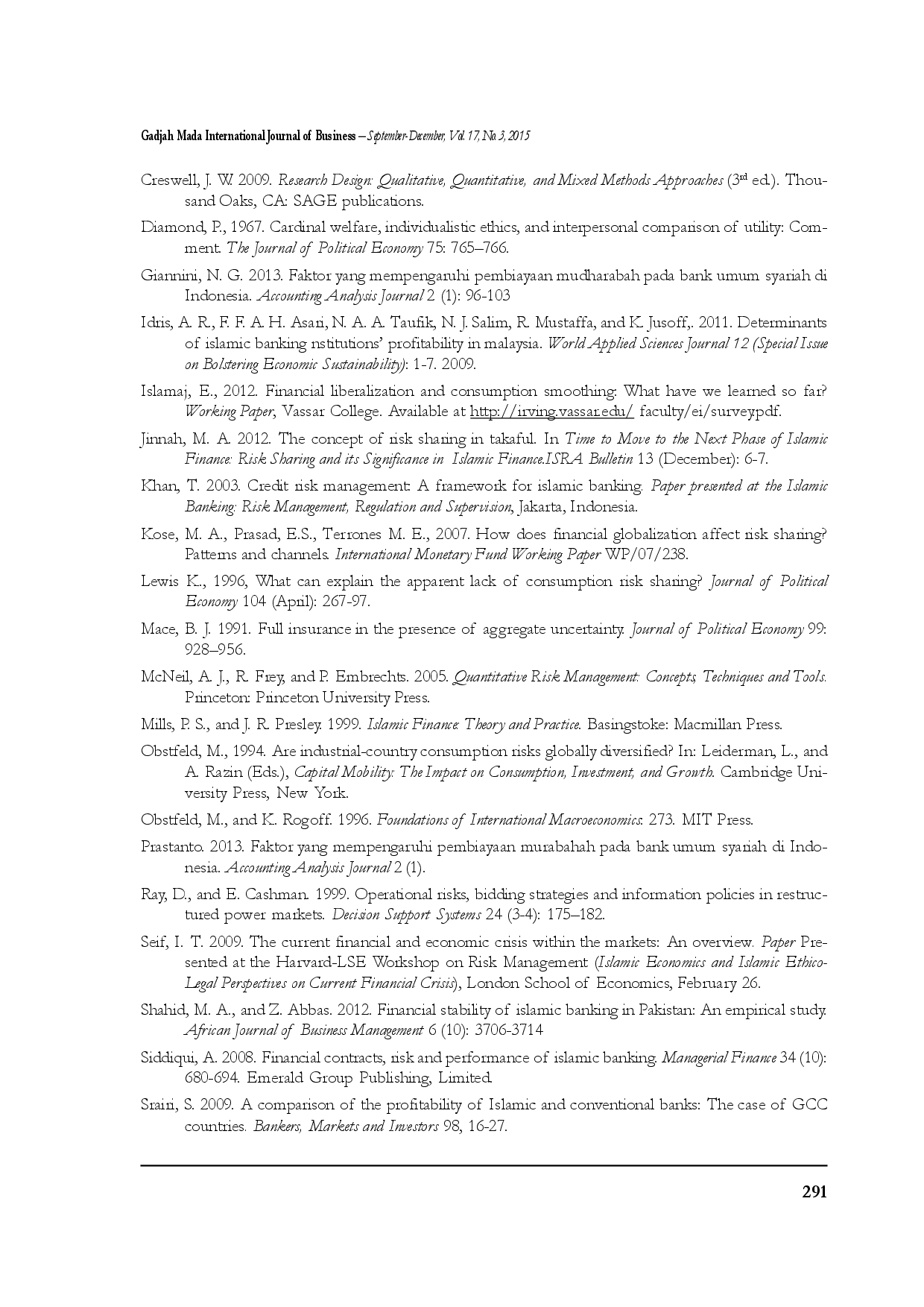 Gadjah Mada International Journal of BusinessGadjah Mada International Journal of BusinessPenelitian ini bertujuan untuk menganalisis pengaruh risiko kredit, likuiditas dan operasional pada enam produk pembiayaan perbankan syariah di Indonesia yaitu mudharabah, musyarakah, murabahah, istishna, ijarah dan qardh, dalam rangka untuk mencoba menjawab pertanyaan apakah atau tidak, perbankan syariah di Indonesia berbasis “risk sharing sistem. Penelitian ini mengunakan model efek tetap berdasarkan metode analisis data panel, dengan fokus pada periode dari tahun 2007 sampai 2013. Demikian, penelitian ini merupakan penelitian bersifat eksploratif dan deskriptif pada keseluruhan bank syariah Indonesia yang beroperasi saat ini di tahun 2013. Hasil dari penelitian ini menunjukkan bahwa, sistem perbankan syariah di Indonesia dapat dinyatakan memiliki produk perbankan berbasis “pembagian risiko. Kami menemukan bahwa risiko kredit, operasional dan likuiditas secara keseluruhan, memiliki pengaruh yang signifikan terhadap pembiayaan mudarabah, musyarakah, murabahah, istishna, ijarah dan qardh. Ada korelasi antara risiko kredit dan pembiayaan mudarabah, dan tidak ada korelasi antara kredit risiko dan pembiayaan musyarakah, murabahah, ijarah, istishna dan qardh. Ada pun korelasi antara risiko operasional dan pembiayaan mudarabah dan murabahah, dan tidak ada korelasi antara risiko operasional dan pembiayaan musyarakah, istishna, ijarah dan qardh. Ada korelasi antara risiko likuiditas dan pembiayaan istishna, dan tidak ada korelasi antara risiko likuiditas dan pembiayaan musyarakah, mudarabah, murabahah, ijarah dan qardh. Implikasi utama dari penelitian ini adalah kenyataan bahwa tidak ada hubungan risiko kredit dan pembiayaan berdasarkan musharakah, yang merupakan modus pembiayaan dimana bank syariah berbagi risiko dengan klien, tetapi ada pengaruh risiko kredit dengan pembiayaan mudharabah, modus pembiayaan dimana bank syariah menanggung semua risiko. Temuan ini dapat mengakibatkan kesimpulan bahwa sektor perbankan syariah di Indonesia berdasarkan pada “risk sharing sistem.