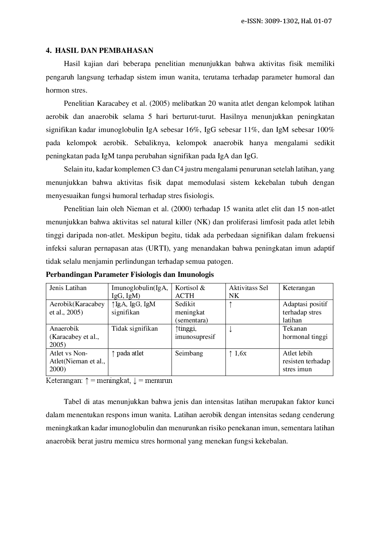 Mutiara Pendidikan dan OlahragaMutiara Pendidikan dan OlahragaOlahraga teratur berperan penting dalam menjaga dan meningkatkan fungsi sistem kekebalan tubuh, terutama pada wanita atlet yang mengalami tekanan hormonal dan fisiologis selama latihan. Artikel tinjauan ini bertujuan untuk menjelaskan pengaruh latihan aerobik dan anaerobik terhadap parameter imun humoral serta respons hormon stres pada wanita atlet dibandingkan dengan wanita yang tidak aktif. Berdasarkan hasil berbagai penelitian, aktivitas fisik yang dilakukan secara moderat dan konsisten dapat meningkatkan kadar imunoglobulin (IgA, IgG, dan IgM) serta memperkuat sistem perlindungan imun. Sebaliknya, latihan berintensitas tinggi atau berlebihan dapat meningkatkan kadar kortisol dan ACTH yang berpotensi menekan fungsi imun sementara. Hasil penelitian juga menunjukkan bahwa wanita atlet memiliki profil imun yang lebih baik dibandingkan dengan wanita tidak aktif, ditandai dengan peningkatan aktivitas sel natural killer dan proliferasi limfosit. Namun, latihan berlebihan dapat menyebabkan ketidakseimbangan imunologis. Dengan demikian, olahraga berintensitas sedang dan program latihan yang terencana dengan baik terbukti mampu menjaga daya tahan tubuh serta mencegah risiko penurunan imunitas. Kajian ini diharapkan dapat memperluas wawasan dalam bidang imunologi olahraga dan kesehatan wanita.