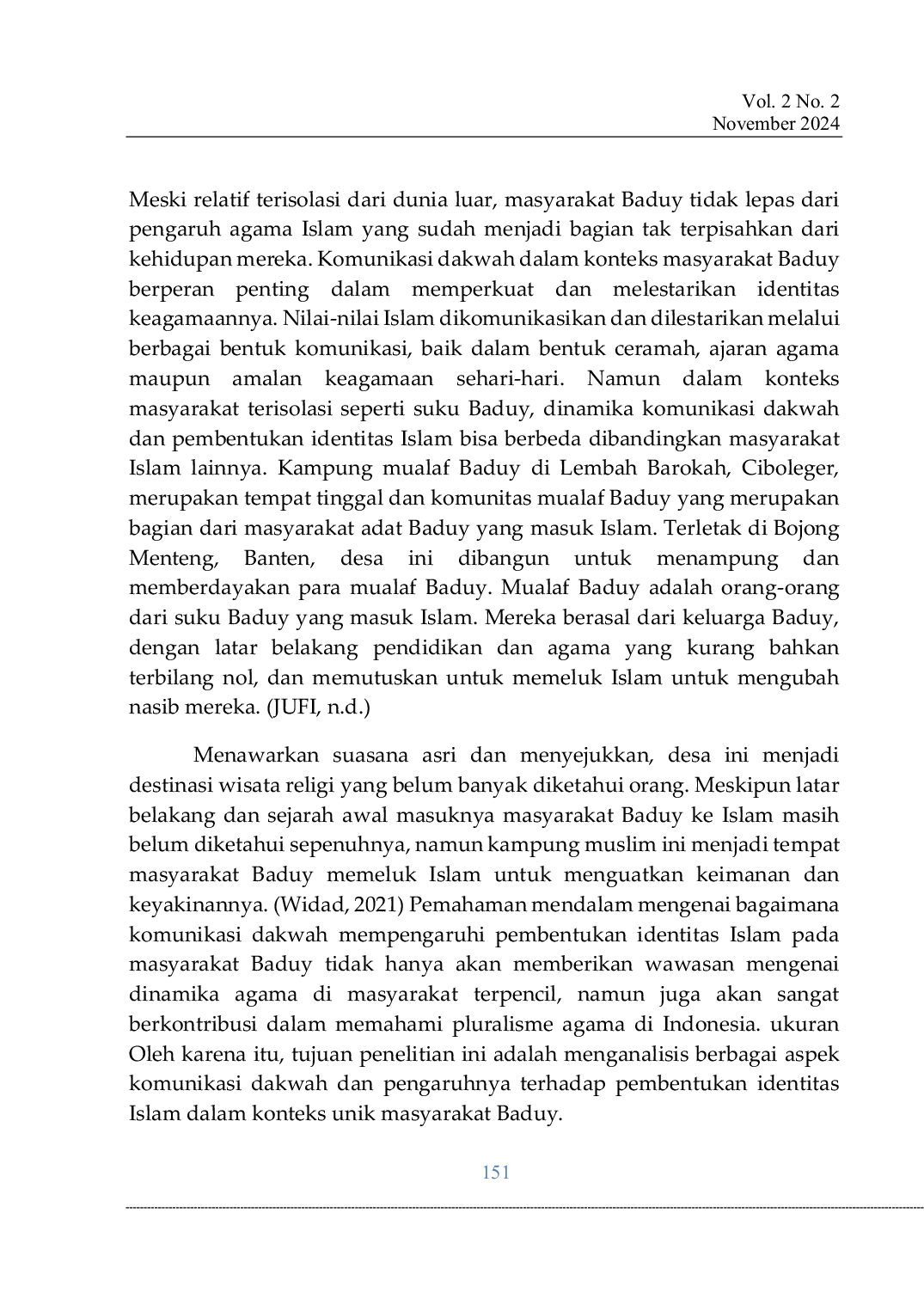 Mu'ashir: Jurnal Dakwah dan Komunikasi IslamMu'ashir: Jurnal Dakwah dan Komunikasi IslamMasyarakat Baduy, etnis minoritas yang tinggal di wilayah Banten, Indonesia, dikenal menjaga nilai-nilai tradisional dan hidup sederhana. Meski relatif terisolasi dari dunia luar, masyarakat Baduy tidak lepas dari pengaruh agama Islam yang sudah menjadi bagian tak terpisahkan dari kehidupan mereka. Tujuan penelitian ini untuk menganalisis peran dakwah dalam pembentukan identitas Islam pada masyarakat Baduy yang masuk Islam di Desa Ciboleger. Metode penelitian menggunakan etnografi untuk mengamati interaksi sosial, ritual keagamaan dan metode komunikasi masyarakat. Hasil penelitian menunjukkan bahwa komunikasi dakwah berperan penting dalam proses konversi dan internalisasi nilai- nilai Islam, serta pembentukan identitas keagamaan baru di kalangan masyarakat Badui. Dakwah dilakukan melalui pendekatan individu dan komunitas yang menekankan pada ajaran agama dan menghormati tradisi lokal. Identitas Islam yang tercipta mencerminkan perpaduan ajaran Islam dan budaya lokal, sehingga menciptakan identitas yang dinamis dan unik di kalangan masyarakat Baduy yang telah bertransformasi. Kajian ini memberikan kontribusi untuk memahami proses dakwah dan pembentukan identitas keagamaan dalam konteks masyarakat adat di Indonesia.