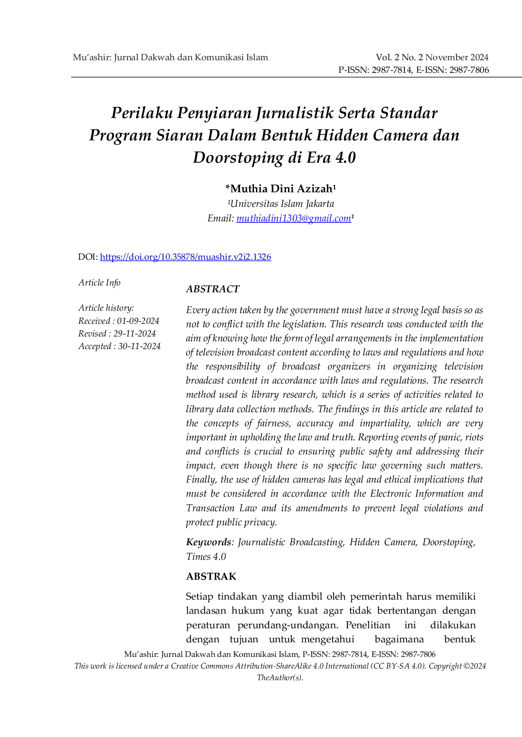 Mu'ashir: Jurnal Dakwah dan Komunikasi IslamMu'ashir: Jurnal Dakwah dan Komunikasi IslamSetiap tindakan yang diambil oleh pemerintah harus memiliki landasan hukum yang kuat agar tidak bertentangan dengan peraturan perundang-undangan. Penelitian ini dilakukan dengan tujuan untuk mengetahui bagaimana bentuk pengaturan hukum dalam pelaksanaan isi siaran televisi menurut peraturan Perundang-Undangan dan bagaimana tanggung jawab penyelenggara siaran dalam menyelenggarakan isi siaran televisi yang sesuai dengan peraturan Perundang-Undangan. Metode penelitian yang digunakan adalah menggunakan jenis penelitian kepustakaan (library research) yaitu serangkaian kegiatan yang berkenaan dengan metode pengumpulan data pustaka. Temuan dalam artikel ini adalah terkait dengan konsep keadilan, akurasi, dan imparsialitas merupakan hal yang sangat penting dalam menegakkan hukum dan kebenaran. Pelaporan peristiwa kepanikan, kerusuhan, dan konflik sangat penting untuk memastikan keselamatan masyarakat dan mengatasi dampaknya, meskipun belum ada undang-undang khusus yang mengatur hal tersebut. Terakhir, penggunaan hidden camera memiliki implikasi hukum dan etika yang harus diperhatikan sesuai dengan Undang-Undang Informasi dan Transaksi Elektronik serta perubahannya untuk mencegah pelanggaran hukum dan melindungi privasi masyarakat.
