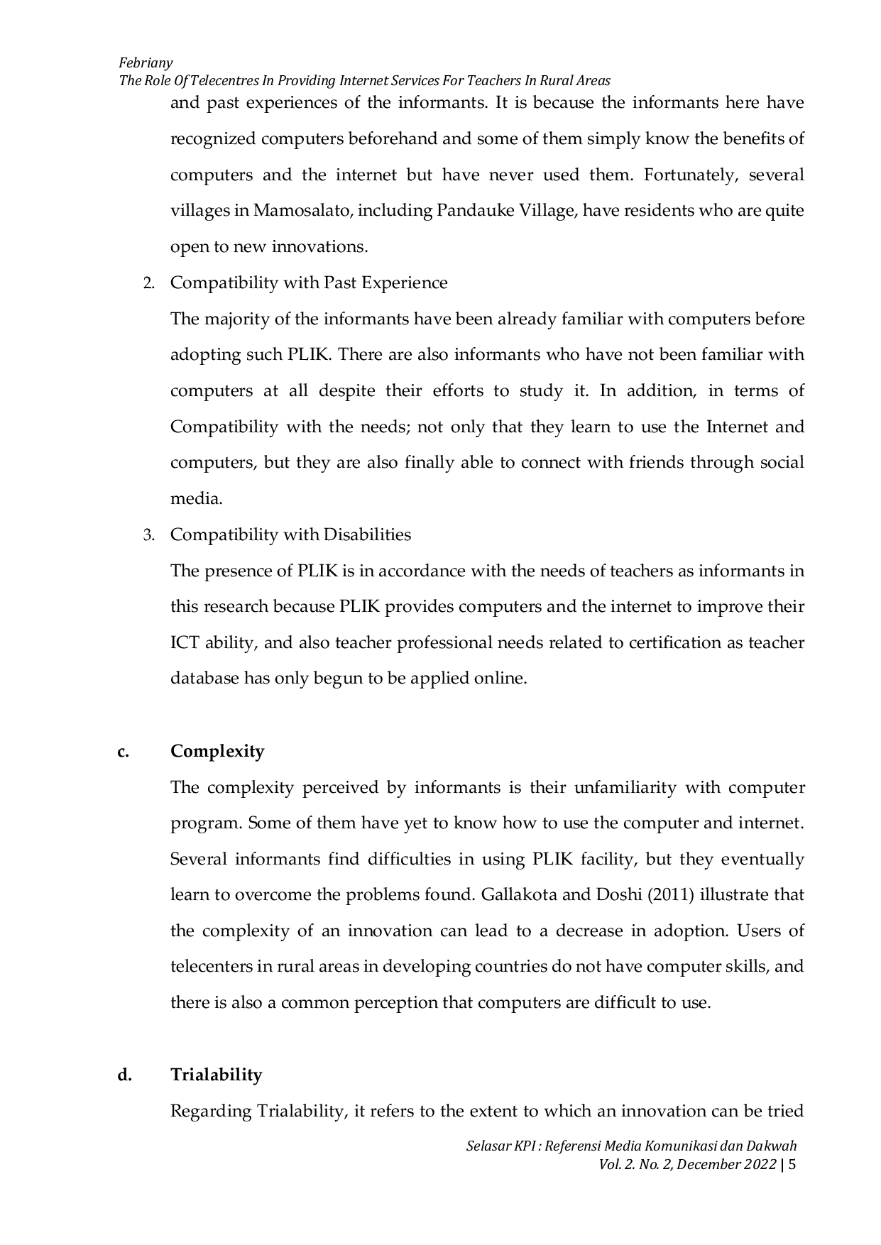 Jurnal Selasar KPI : Referensi Media Komunikasi dan DakwahJurnal Selasar KPI : Referensi Media Komunikasi dan DakwahKesenjangan antara perkotaan dan pedesaan masih terjadi di Indonesia. Masih banyak daerah terpencil dan tertinggal yang masih memerlukan perhatian khusus dari pemerintah. Kesenjangan tersebut tidak hanya terjadi pada pengetahuan, namun juga pada sarana dan prasarana dalam mengakses teknologi. Desa Pandauke merupakan desa yang terpencil, tidak hanya dari segi geografis tetapi juga demografi. PLIK merupakan salah satu bentuk telecenter yang merupakan inovasi yang diharapkan dapat mengurangi kesenjangan. Peran guru di desa terpencil cukup penting sehingga dituntut untuk terus meningkatkan profesionalismenya. Penelitian ini bertujuan untuk melihat atribut inovasi dalam PLIK ditinjau dari pendapat guru di Desa Pandauke. Penelitian ini menggunakan metode kualitatif dengan penyajian deskriptif analisis. Hasil penelitian menunjukkan bahwa 5 inovasi yaitu Relative Advantage, Compatibility, Complexity, Trialability dan Observability juga dianggap penting oleh guru untuk mengadopsi suatu inovasi, dalam hal ini adalah PLIK yang berlokasi di Desa Pandauke.