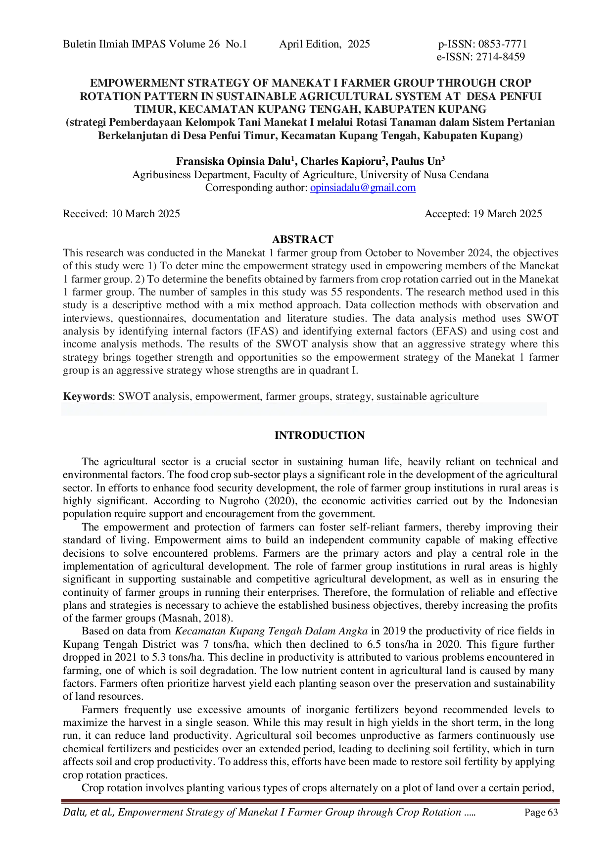 1. Untuk anggota Kelompok Tani Manekat 1: Pertahankan kekuatan yang dimiliki saat ini dan manfaatkan sepenuhnya peluang yang tersedia dengan menerapkan strategi SO. Ini termasuk memaksimalkan penggunaan lahan untuk rotasi tanaman guna meningkatkan produktivitas, mendorong lebih banyak petani untuk melakukan rotasi dengan melon karena keuntungan yang lebih tinggi, membangun kemitraan yang kuat dengan penyuluh dan kolaborator untuk kerjasama jangka panjang, dan mengoptimalkan penggunaan teknologi yang tersedia untuk memudahkan pertanian dan meningkatkan keuntungan.. 2. Untuk pemerintah daerah: Diharapkan agar lebih memperhatikan kesejahteraan petani dengan mengeluarkan kebijakan yang memfasilitasi kegiatan pertanian.. 3. Untuk peneliti selanjutnya: Diharapkan agar penelitian ini dapat menjadi referensi untuk studi lebih lanjut tentang faktor internal dan eksternal yang terlibat dalam inisiatif pemberdayaan petani.