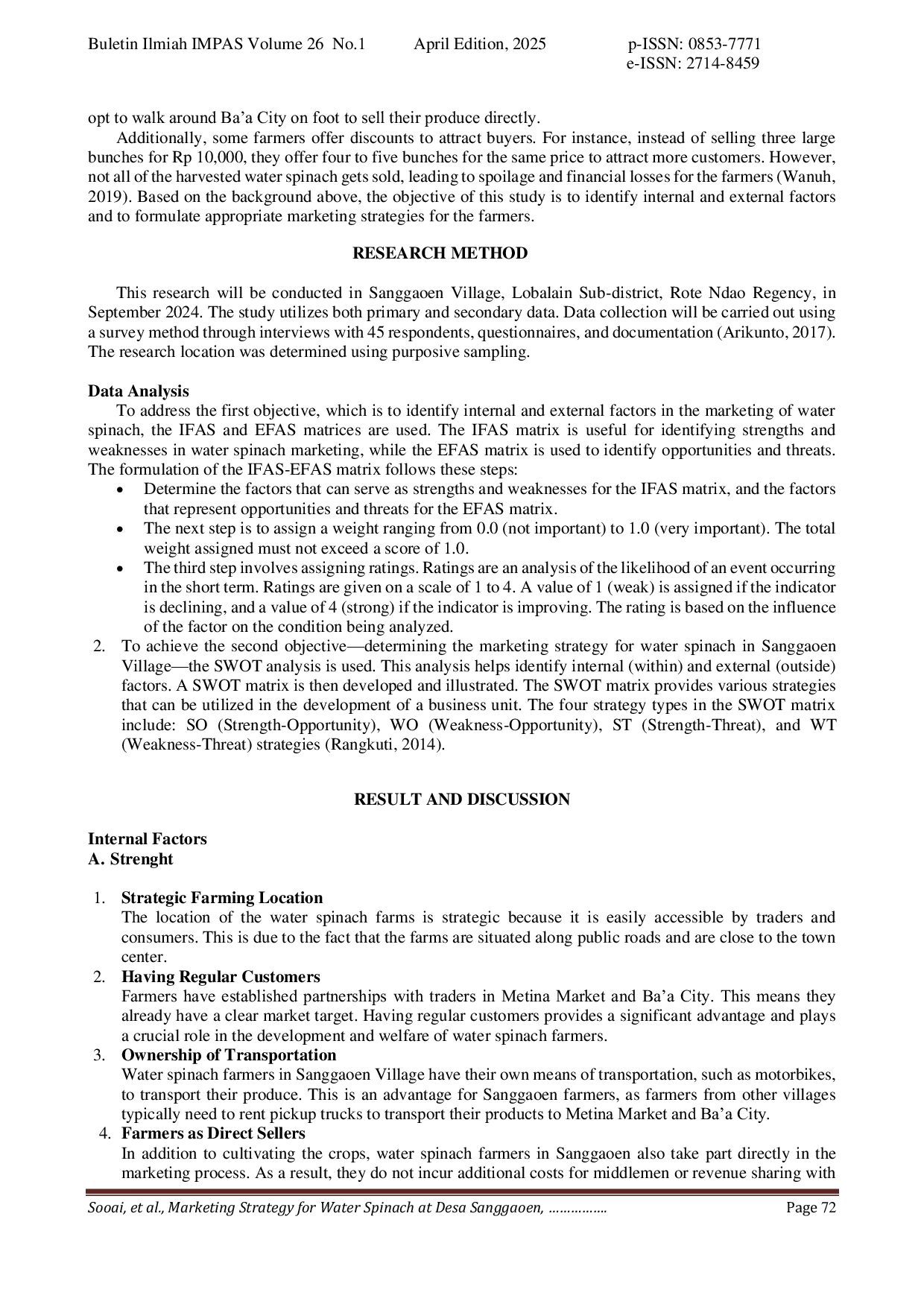 Buletin Ilmiah IMPASBuletin Ilmiah IMPASPenelitian tentang Strategi Pemasaran Komoditas Bayam Air di Desa Sanggaoen, Kecamatan Lobalain, Kabupaten Rote Ndao bertujuan untuk (1) mengidentifikasi faktor internal dan eksternal dalam pemasaran komoditas bayam air di Desa Sanggaoen dan (2) menentukan strategi pemasaran untuk komoditas bayam air di Desa Sanggaoen. Penelitian ini dilakukan pada bulan September 2024 di Desa Sanggaoen, Kecamatan Lobalain, Kabupaten Rote Ndao. Sumber data dalam penelitian ini terdiri dari 45 petani bayam air. Metode yang digunakan dalam pengumpulan data adalah metode wawancara dengan panduan kuesioner. Untuk menentukan strategi pemasaran, digunakan analisis SWOT. Hasil penelitian menunjukkan bahwa faktor-faktor yang menentukan pemasaran komoditas bayam air meliputi faktor internal yang terdiri dari kekuatan seperti lokasi pertanian yang strategis, memiliki pelanggan tetap, memiliki transportasi, dan petani menjual langsung, serta kelemahan seperti umur simpan produk yang pendek, ketidakmampuan untuk menetapkan harga bayam air secara mandiri, dan penggunaan teknologi yang kurang memadai untuk promosi. Faktor eksternal yang memengaruhi meliputi peluang seperti banyaknya restoran, penggunaan media sosial untuk pemasaran, dan peluang pangsa pasar yang luas. Ancaman meliputi fluktuasi harga bayam air, bisnis pertanian serupa, dan penyakit yang menyerang bayam air. Strategi pemasaran yang diterapkan oleh petani di Desa Sanggaoen adalah (1) memanfaatkan jaringan pelanggan tetap, (2) memberikan insentif kepada pelanggan tetap, (3) melakukan pelatihan bagi petani untuk menggunakan teknologi digital, dan (4) menerapkan sistem pra-pemesanan.