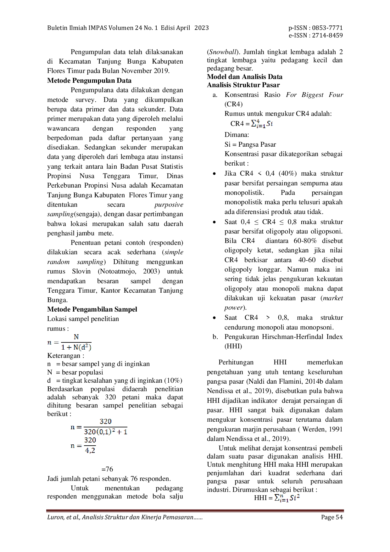 Buletin Ilmiah IMPASBuletin Ilmiah IMPASPenelitian ini bertujuan untuk menganalisis struktur dan kinerja pemasaran jambu mete di Kecamatan Tanjung Bunga, Kabupaten Flores Timur. Responden penelitian adalah petani jambu mete dan lembaga pemasaran yang terlibat dalam pemasaran jambu mete dari petani sebagai produsen dan ke pedagang antar pulau sebagai konsumen. Hasil penelitian menunjukkan bahwa struktur pasar jambu mete secara kuantitatif adalah pasar persaingan tidak sempurna atau oligopsoni, dan kinerja pasar membentuk dua saluran pemasaran. Margin pemasaran tertinggi pada saluran dua, dan pemasaran yang paling banyak memperoleh keuntungan juga pada saluran dua. Penelitian ini juga menemukan bahwa petani cenderung sebagai penerima harga (price taker) dan posisi tawar petani lemah dalam proses penentuan harga.