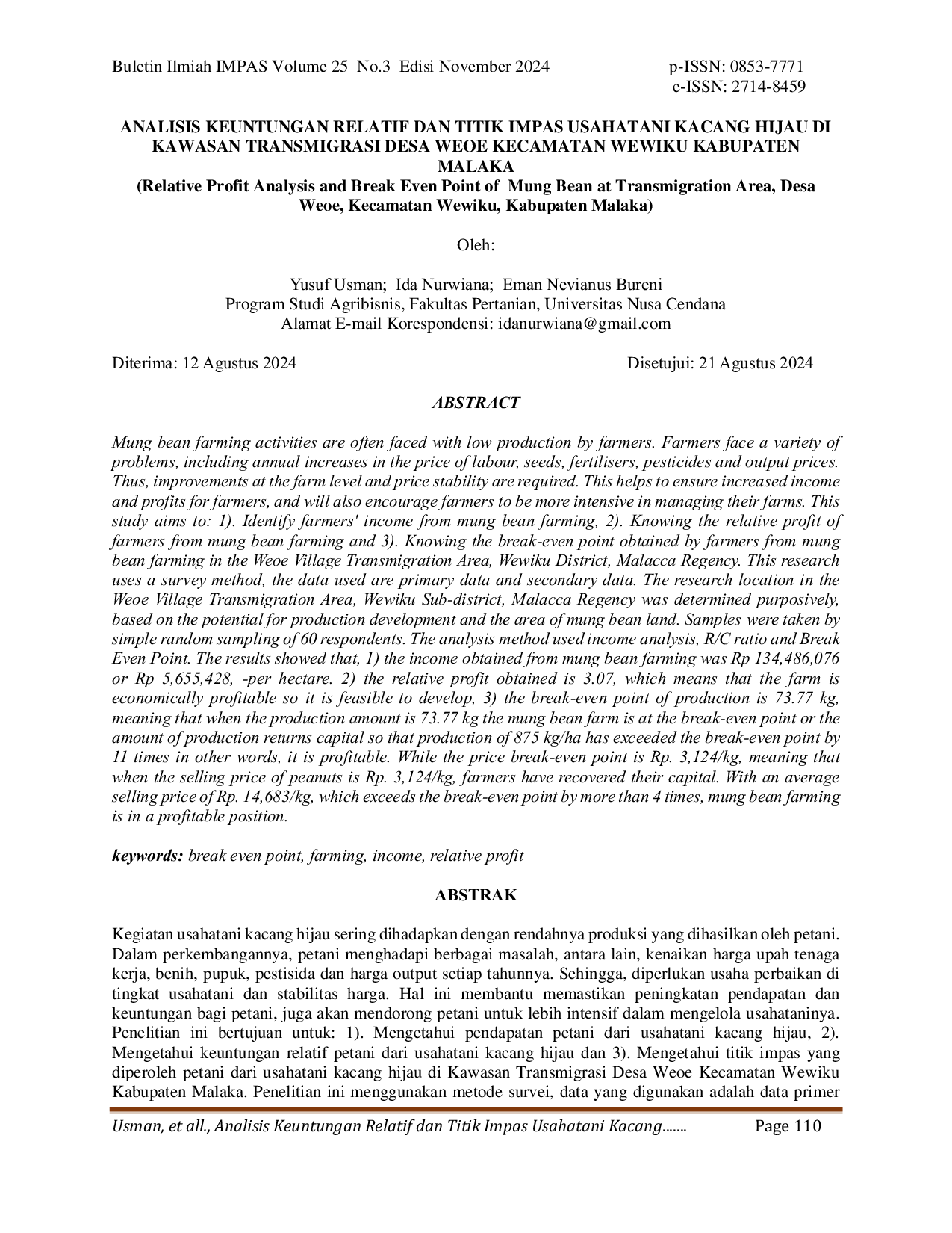 Buletin Ilmiah IMPASBuletin Ilmiah IMPASKegiatan usahatani kacang hijau sering dihadapkan dengan rendahnya produksi yang dihasilkan oleh petani. Dalam perkembangannya, petani menghadapi berbagai masalah, antara lain, kenaikan harga upah tenaga kerja, benih, pupuk, pestisida dan harga output setiap tahunnya. Sehingga, diperlukan usaha perbaikan di tingkat usahatani dan stabilitas harga. Hal ini membantu memastikan peningkatan pendapatan dan keuntungan bagi petani, juga akan mendorong petani untuk lebih intensif dalam mengelola usahataninya. Penelitian ini bertujuan untuk: 1). Mengetahui pendapatan petani dari usahatani kacang hijau, 2). Mengetahui keuntungan relatif petani dari usahatani kacang hijau dan 3). Mengetahui titik impas yang diperoleh petani dari usahatani kacang hijau di Kawasan Transmigrasi Desa Weoe Kecamatan Wewiku Kabupaten Malaka. Penelitian ini menggunakan metode survei, data yang digunakan adalah data primer dan data sekunder. Lokasi penelitian di Kawasan Transmigrasi Desa Weoe Kecamatan Wewiku Kabupaten Malaka yang ditentukan secara purposive, didasarkan potensi pengembangan produksi dan luas lahan kacang hijau. Sampel diambil secara acak sederhana (simple random sampling) sebanyak 60 responden. Metode analisis menggunakan analisis pendapatan, R/C ratio dan Break Even Point. Hasil penelitian menunjukkan bahwa, 1) pendapatan yang diperoleh dari usahatani kacang hijau sebesar Rp 134.486.076 atau Rp 5.655.428,- per hektar. 2) keuntungan relatif yang diperoleh sebesar 3,07 yang berarti secara ekonomi usahatani menguntungkan sehingga layak untuk dikembangkan, 3) titik impas produksi sebesar 73,77 kg, artinya pada saat jumlah produksi 73,77 kg usahatani kacang hijau berada pada titik impas atau jumlah produksi balik modal sehingga produksi sebesar 875 kg/ha telah melebihi titik impas sebesar 11 kali lipat dengan kata lain memperoleh keuntungan. Sedangkan titik impas harga sebesar Rp 3.124/kg, artinya pada saat harga jual kacang Rp. 3.124/kg mencapai titik impas, petani telah memperoleh kembali modalnya. Dengan harga jual rata-rata Rp. 14.683/kg, yang melampaui titik impas lebih dari 4 kali lipat, usahatani kacang hijau berada pada posisi yang menguntungkan.