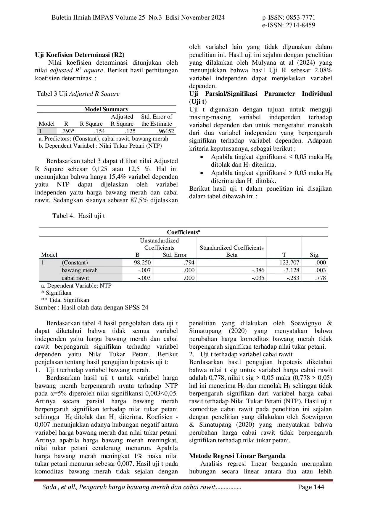 Buletin Ilmiah IMPASBuletin Ilmiah IMPASPenelitian ini bertujuan untuk mengetahui fluktuasi harga dan bagaimana harga bawang merah dan cabai rawit berpengaruh terhadap Nilai Tukar Petani (NTP). Data yang digunakan adalah data sekunder berupa data harga bawang merah dan cabai rawit tahun 2019-2023 yang diperoleh dari BPS Privinsi NTT. Fluktuasi harga diukur dengan menggunakan koefisien variasi sedangkan pengaruh harga bawang merah dan cabai rawit dengan analisis regresi linear berganda. Hasil penelitian ini menunjukkan bahwa harga bawang merah lebih homogen dari harga cabai rawit dengan angka koefisiennya sebesar 19.80% atau harga cabai rawit lebih heterogen dari harga bawang merah dengan angka koefisien variasinya sebesar 22.63%. Secara keseluruhan perubahan harga bawang merah dan cabai rawit berpengaruh signifikan terhadap nilai tukar petani dengan nilai koefisien determinasi adjusted R2 menyatakan sebesar 12,5% variasi pada nilai tukar petani dapat dijelaskan oleh perubahan harga bawang merah dan cabai rawit. Namun apabila dianalisis secara parsial ditemukan hanya harga komoditas bawang merah yang berpengaruh signifikan negatif terhadap nilai tukar petani sedangkan perubahan harga komoditas cabai rawit tidak perpengaruh signifikan terhadap nilai tukar petani. Nilai signifikan negatif antara harga bawang merah dan cabai rawit terhadap nilai tukar petani menunjukkan bahwa harga jual komoditas bawang merah dan cabai rawit lebih rendah dibandingkan harga input. Penurunan nilai tukar petani dapat menunjukkan bahwa petani mengalami kekurangan daya beli yang juga menurunkan tingkat kesejahteraan petani. Peran pemerintah Nusa Tenggara Timur diperlukan untuk menyediakan pasokan bibit bawang merah dan cabai rawit dalam merangsang petani untuk meningkatkan produksi tanaman tersebut yang dapat mengurangi pasokan dari luar daerah. Hal ini dalam menekan harga input dan memperoleh harga jual yang lebih besar.