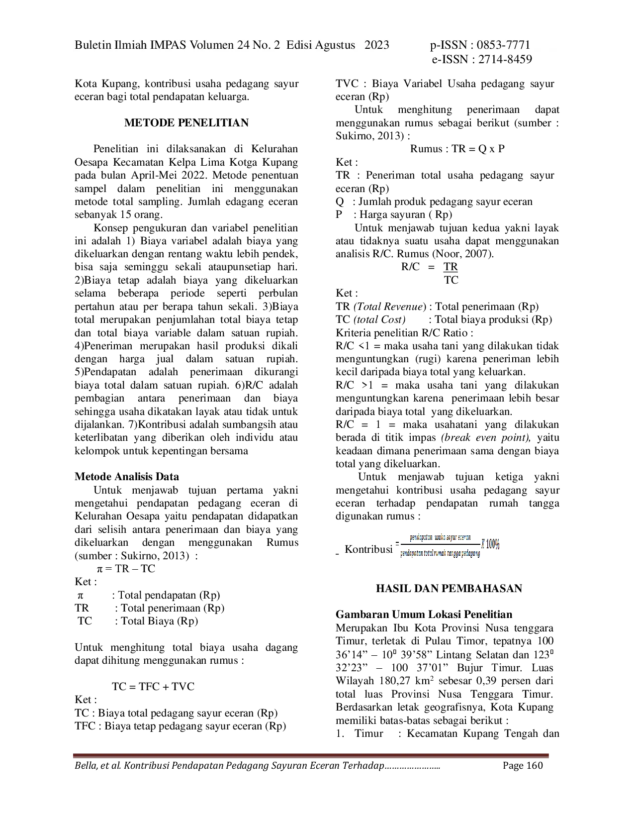 Buletin Ilmiah IMPASBuletin Ilmiah IMPASPenelitian ini bertujuan untuk; 1) Berapa pendapatan pedagang sayur eceran di Kelurahan Oesapa Kecamatan Kelapa Lima Kota Kupang, 2) Bagaimana kelayakan usaha pedagang sayur eceran Kelurahan Oesapa Kecamatan Kelapa Lima Kota Kupang ?, 3) Bagaimana kontribusi usaha pedagang sayur eceran bagi total pendapatan keluarga ?. Penentuan sampel dalam penelitian ini dilakukan secara total sampling dimana populasi sekaligus menjadi sampel dalam penelitian karena jumlah pedagang sayur eceran yang ditemui tidak terlalu banyak, sedangkan pengambilan datanya menggunakan metode survei. Pengumpulan data dilakukan pada bulan Mei 2022 sampai bulan Juni 2022 yang mana data yang diambil adalah data primer dan data sekunder kemudian dilakukan analisis data menggunakan analisis deskriptif kualitatif. Variabel yang diukur adalah biaya, penerimaan, pendapatan, keuntungan relatif, dan kontribusinya terhadap pendapatan keluarga pedagang. Hasil penelitian menunjukkan bahwa: (1) Dalam menjalankan usaha pedagang sayur eceran pendapatan yang diperoleh sebesar Rp. 1.401.015/bulan. (2) Dilihat dari nilai ekonomisnya, usaha pedagang sayur eceran layak secara ekonomi yaitu didapatkan dengan dicari R/C rationya 1,5. R/C ratio pedagang yang berjualan di Kelurahan Oesapa pada kisaran 1,25 – 1,64. (3) Kontribusi yang didapatkan dari usaha pedagang sayur eceran yaitu sebesar 53,11 %. Hal ini menunjukkan bahwa usaha pedagang sayur eceran menjadi salah satu sumber pendapatan rumah tangga pedagang usaha sayur eceran.