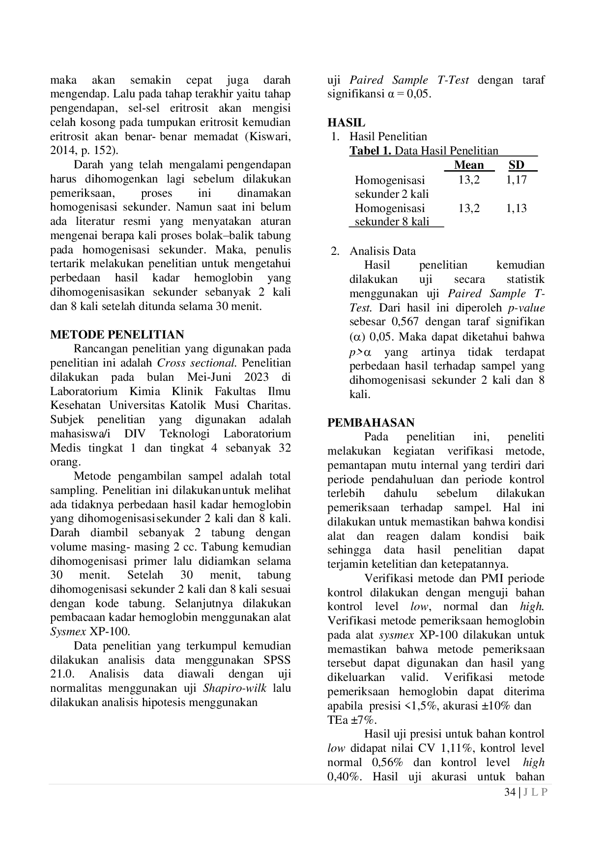 Jurnal Laboratorium PrimaJurnal Laboratorium PrimaPemeriksaan hemoglobin merupakan salah satu pemeriksaan yang dilakukan di laboratorium klinik yang bertujuan untuk mengetahui kadar hemoglobin dalam tubuh seseorang. Sampel pemeriksaan yang digunakan dalam pemeriksaan hemoglobin merupakan darah dengan antikoagulan EDTA. Antikoagulan berperan untuk menonaktifkan faktor pembekuan darah. Maka dari itu, darah yang telah dimasukkan kedalam tabung dengan antikoagulan harus segera dihomogenisasi primer. Pada pelaksanaan dilapangan, sampel darah yang sudah ditampung biasanya tidak langsung diperiksa sehingga terjadi penundaan. Darah yang telah dihomogenisasi primer jika didiamkan akan mengalami pengendapan. Maka dari itu, sampel darah harus dihomogenisasi kembali (homogenisasi sekunder) sebelum dilakukan pemeriksaan. Untuk melihat apakah ada perbedaan kadar hemoglobin yang dihomogenisasi sekunder sebanyak 2 dan 8 kali setelah didiamkan selama 30 menit. Jenis penelitian ini adalah penelitian observasional dengan rancangan penelitian cross sectional. Subjek penelitian yang diperiksa sebanyak 32 orang. Subjek penelitian dilakukan pengambilan darah sebanyak 2 tabung lalu masing-masing tabung dihomogenisasi primer 8 kali dan didiamkan selama 30 menit. Setelah 30 menit, tabung dengan kode A dihomogenisasi sekunder 2 kali lalu diperiksa pada alat Sysmex XP-100 dan tabung dengan kode B dihomogenisasi sekunder 8 kali lalu diperiksa pada alat Sysmex XP-100. Data dianalisis menggunakan uji Paired Sample T-Test dengan tingkat kepercayaan 95%. Kadar hemoglobin untuk tabung yang dihomogenisasi sekunder 2 kali diperoleh nilai mean 13,2 g/dL dan standar deviasi (SD) 1,17 g/dL sedangkan untuk tabung yang dihomogenisasi sekunder 8 kali diperoleh nilai mean 13,2 g/dL dan SD 1,13 g/dL. Hasil uji statistik menunjukkan bahwa tidak terdapat p = 0,567 (>0,05). Berdasarkan hasil penelitian dapat disimpulkan bahwa tidak terdapat perbedaan yang bermakna dari hasil tabung yang dihomogenisasi sekunder 2 kali dan 8 kali. Pada penelitian selanjutnya, jumlah sampel yang digunakan harus diperbanyak lagi.