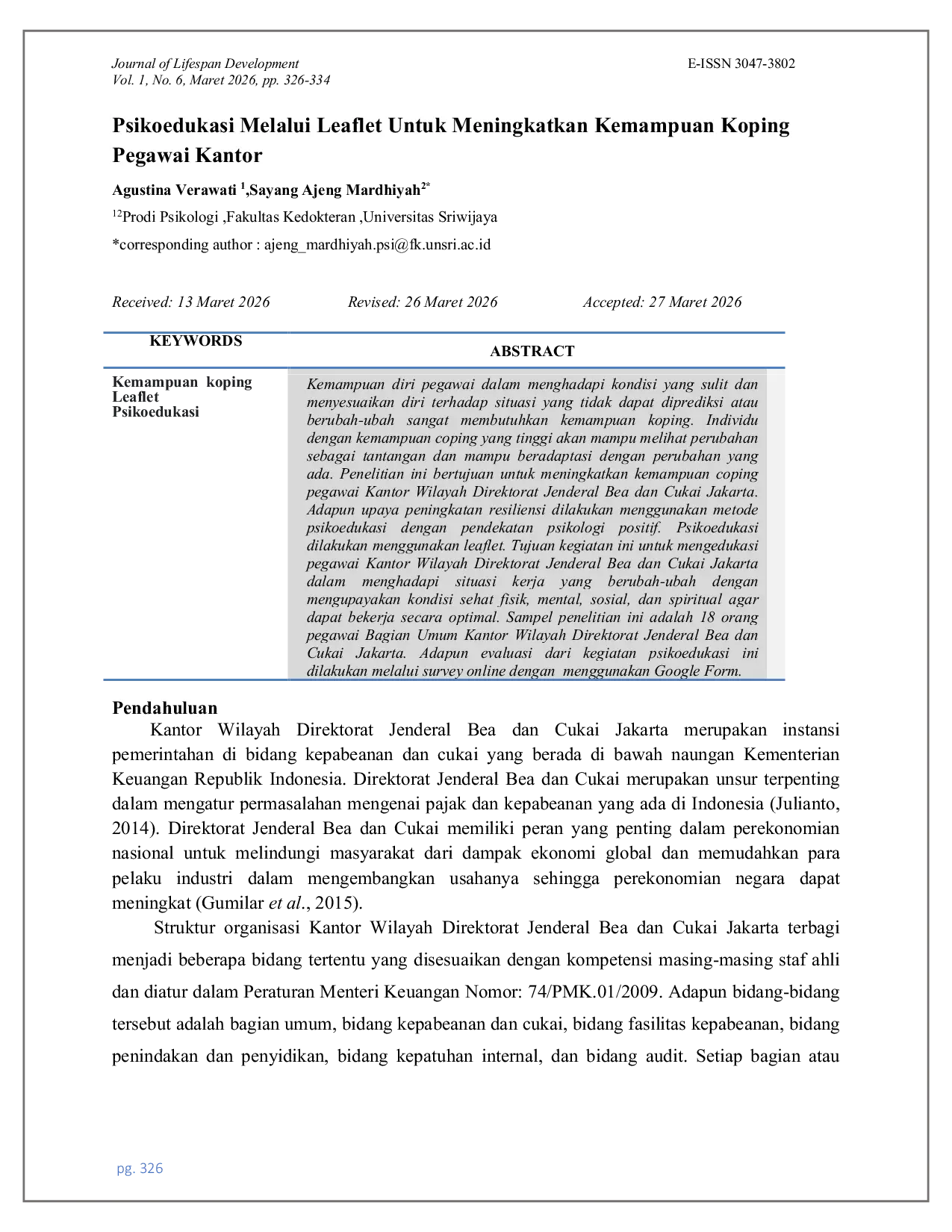 Journal of Life Span DevelopmentJournal of Life Span DevelopmentKemampuan diri pegawai dalam menghadapi kondisi yang sulit dan menyesuaikan diri terhadap situasi yang tidak dapat diprediksi atau berubah-ubah sangat membutuhkan kemampuan koping. Individu dengan kemampuan coping yang tinggi akan mampu melihat perubahan sebagai tantangan dan mampu beradaptasi dengan perubahan yang ada. Penelitian ini bertujuan untuk meningkatkan kemampuan coping pegawai Kantor Wilayah Direktorat Jenderal Bea dan Cukai Jakarta. Upaya peningkatan resiliensi dilakukan menggunakan metode psikoedukasi dengan pendekatan psikologi positif. Psikoedukasi dilakukan menggunakan leaflet. Tujuan kegiatan ini untuk mengedukasi pegawai Kantor Wilayah Direktorat Jenderal Bea dan Cukai Jakarta dalam menghadapi situasi kerja yang berubah-ubah dengan mengupayakan kondisi sehat fisik, mental, sosial, dan spiritual agar dapat bekerja secara optimal.