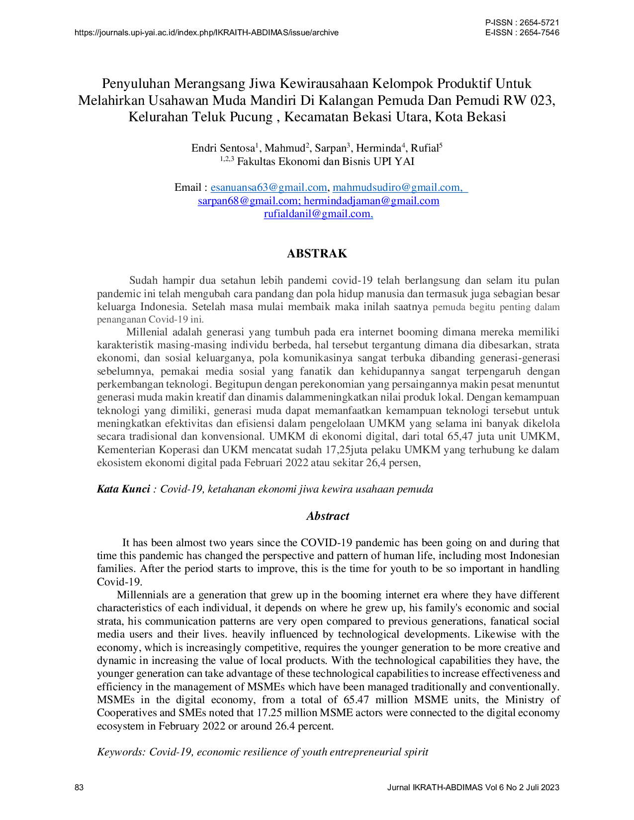 IKRA-ITH ABDIMASIKRA-ITH ABDIMASSudah hampir dua tahun lebih pandemi covid-19 telah berlangsung dan selama itu pula pandemi ini telah mengubah cara pandang dan pola hidup manusia, termasuk sebagian besar keluarga Indonesia. Setelah masa mulai membaik, inilah saatnya pemuda berperan penting dalam penanganan Covid-19. Millenial adalah generasi yang tumbuh pada era booming internet, memiliki karakteristik individu yang berbeda tergantung latar belakang, ekonomi, dan sosial keluarga. Mereka terbuka dalam komunikasi, pengguna media sosial yang fanatik, dan sangat terpengaruh perkembangan teknologi. Perekonomian yang kompetitif menuntut generasi muda lebih kreatif dan dinamis dalam meningkatkan nilai produk lokal. Dengan kemampuan teknologi, generasi muda dapat memanfaatkan teknologi untuk meningkatkan efektivitas dan efisiensi pengelolaan UMKM yang selama ini dikelola secara tradisional. Dari total 65,47 juta unit UMKM, Kementerian Koperasi dan UKM mencatat 17,25 juta pelaku UMKM terhubung ke ekosistem ekonomi digital pada Februari 2022 (sekitar 26,4 persen).