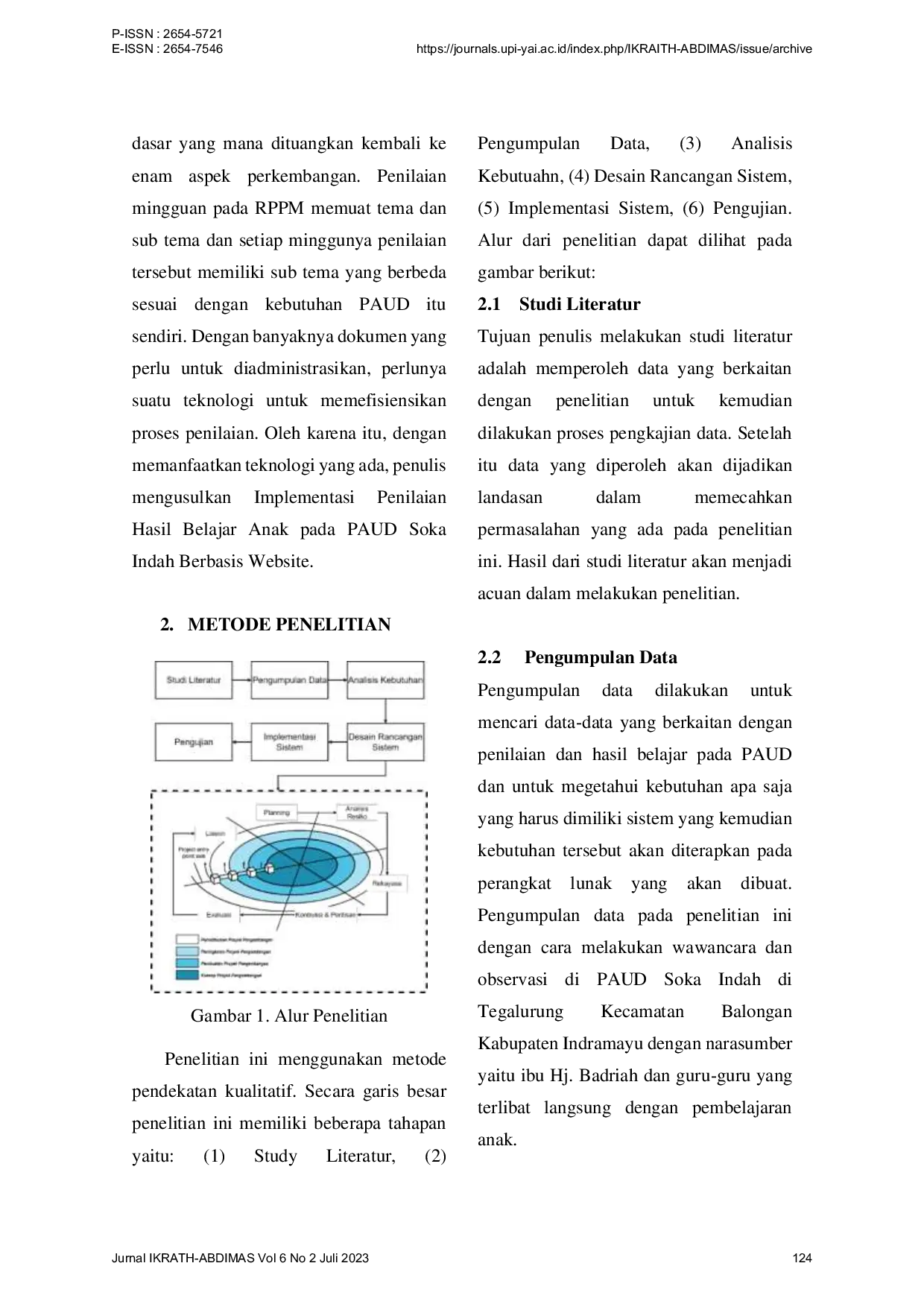 IKRA-ITH ABDIMASIKRA-ITH ABDIMASTeknologi informasi berkembang pesat sehingga mempermudah manusia dalam mengakses segala informasi, termasuk dalam dunia pendidikan anak usia dini (PAUD). Pendidikan anak usia dini atau PAUD merupakan jenjang pendidikan yang ditempuh anak sebelum ia masuk ke sekolah dasar atau SD. Kegitan belajar dari rumah menuntut pendidik untuk lebih siap dalam mempersiapkan kegiatan pembelajaran serta memaksa pendidik untuk memanfaatkan berbagai teknologi untuk memfasilitasi kegiatan pembelajaran. Hal ini menjadi salah satu permasalahan yang muncul dalam pelaksanaan pembelajaran dimasa pandemi seperti saat ini. Sehingga, dibutuhkan sebuah sistem yang dapat memberikan fasilitas bagi pendidik khususnya dalam merekap penilaian dan hasil belajar anak. Oleh karena itu, penelitian ini mengusulkan implementasi Penilaian dan Hasil Belajar Anak pada PAUD Soka Indah Berbasis Web merupakan sebuah website yang digunakan dalam merekap hasil penilaian hasil pembelajaran anak usia dini. Setelah diuji coba, aplikasi yang diusulkan dapat diimplementasikan dengan baik untuk mendukung penilaian hasil belajar anak.