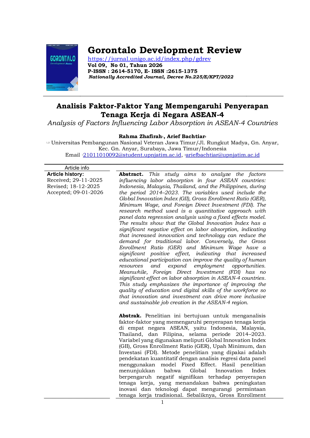 Gorontalo Development ReviewGorontalo Development ReviewPenelitian ini bertujuan untuk menganalisis faktor-faktor yang memengaruhi penyerapan tenaga kerja di empat negara ASEAN, yaitu Indonesia, Malaysia, Thailand, dan Filipina, selama periode 2014–2023. Variabel yang digunakan meliputi Global Innovation Index (GII), Gross Enrollment Ratio (GER), Upah Minimum, dan Investasi (FDI). Metode penelitian yang dipakai adalah pendekatan kuantitatif dengan analisis regresi data panel menggunakan model Fixed Effect. Hasil penelitian menunjukkan bahwa Global Innovation Index berpengaruh negatif signifikan terhadap penyerapan tenaga kerja, yang menandakan bahwa peningkatan inovasi dan teknologi dapat mengurangi permintaan tenaga kerja tradisional. Sebaliknya, Gross Enrollment Ratio (GER) dan Upah Minimum berpengaruh positif signifikan, menunjukkan bahwa peningkatan partisipasi pendidikan mampu meningkatkan kualitas sumber daya manusia dan memperluas kesempatan kerja. Sementara itu, Investasi Asing Langsung (FDI) tidak berpengaruh signifikan terhadap penyerapan tenaga kerja di negara ASEAN-4. Penelitian ini menegaskan pentingnya peningkatan kualitas pendidikan dan keterampilan digital tenaga kerja agar inovasi dan investasi dapat mendorong penciptaan lapangan kerja yang lebih inklusif dan berkelanjutan di kawasan ASEAN-4.