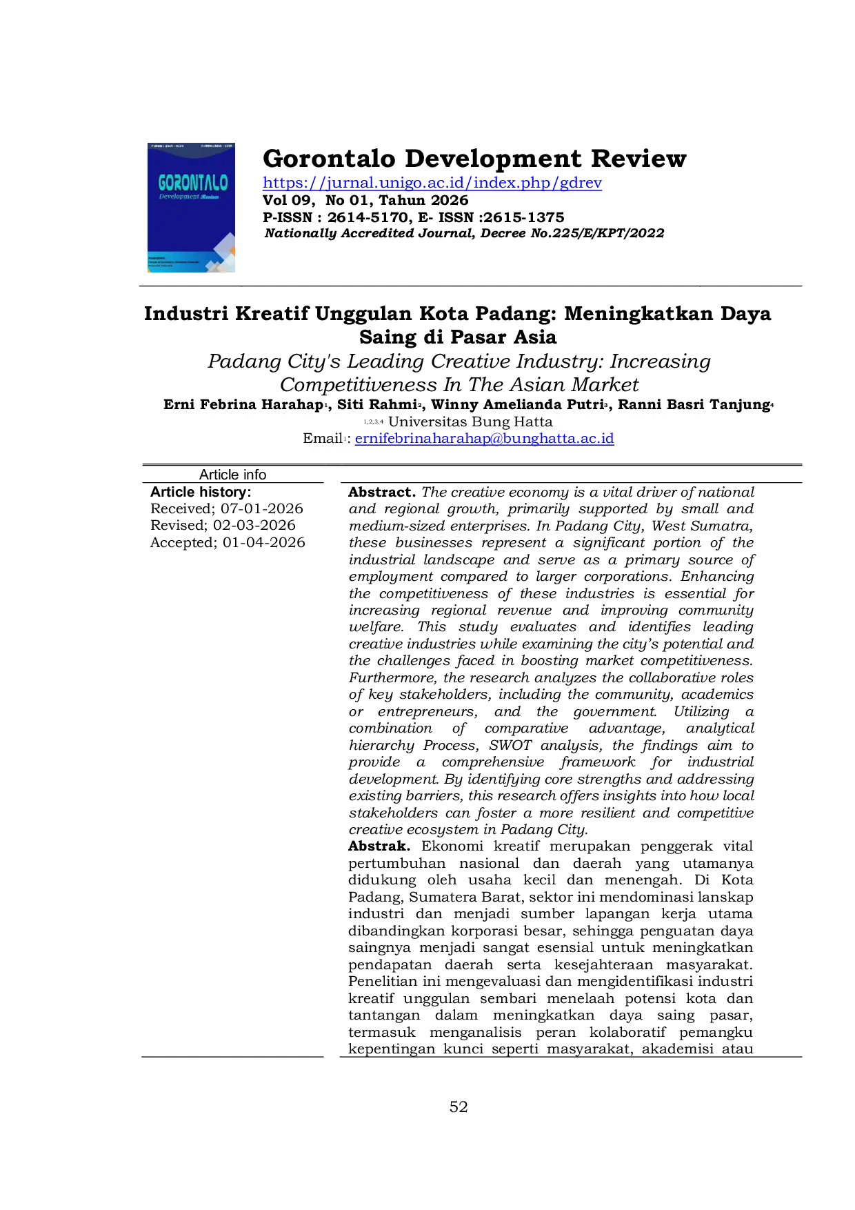 Gorontalo Development ReviewGorontalo Development ReviewEkonomi kreatif merupakan penggerak vital pertumbuhan nasional dan daerah yang utamanya didukung oleh usaha kecil dan menengah. Di Kota Padang, Sumatera Barat, sektor ini mendominasi lanskap industri dan menjadi sumber lapangan kerja utama dibandingkan korporasi besar, sehingga penguatan daya saingnya menjadi sangat esensial untuk meningkatkan pendapatan daerah serta kesejahteraan masyarakat. Penelitian ini mengevaluasi dan mengidentifikasi industri kreatif unggulan sembari menelaah potensi kota dan tantangan dalam meningkatkan daya saing pasar, termasuk menganalisis peran kolaboratif pemangku kepentingan kunci seperti masyarakat, akademisi atau pengusaha, dan pemerintah. Dengan menggunakan metode keunggulan komparatif, Analytical Hierarchy Process, dan analisis SWOT, temuan ini bertujuan untuk menyediakan kerangka kerja komprehensif bagi pengembangan industri guna menciptakan ekosistem kreatif yang lebih tangguh dan kompetitif di Kota Padang melalui identifikasi kekuatan inti serta penanganan hambatan yang ada.