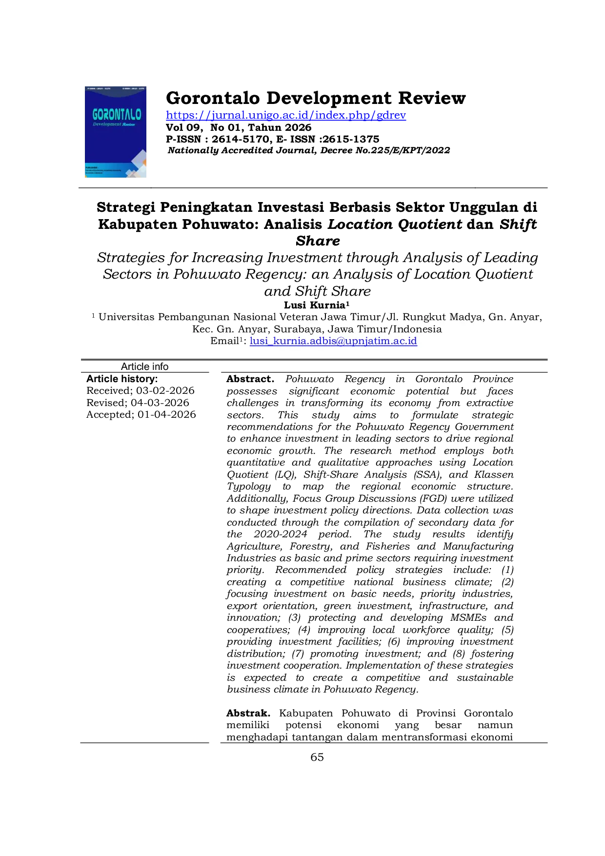 Gorontalo Development ReviewGorontalo Development ReviewKabupaten Pohuwato di Provinsi Gorontalo memiliki potensi ekonomi yang besar namun menghadapi tantangan dalam mentransformasi ekonomi dari sektor ekstraktif. Penelitian ini bertujuan menyusun rekomendasi strategis untuk meningkatkan investasi pada sektor unggulan guna mendorong pertumbuhan ekonomi daerah. Metode penelitian menggunakan pendekatan kuantitatif dan kualitatif melalui teknik analisis Location Quotient (LQ), Shift-Share (SSA), dan Tipologi Klassen untuk memetakan struktur ekonomi regional. Selain itu, penelitian ini juga melaksanakan Focus Group Discussion (FGD) yang digunakan untuk merumuskan arah kebijakan investasi. Pengumpulan data dilakukan melalui kompilasi data sekunder periode 2020-2024. Hasil penelitian mengidentifikasi sektor Pertanian, Kehutanan, dan Perikanan dan Sektor Industri Pengolahan sebagai sektor basis dan prima yang memerlukan prioritas investasi. Strategi kebijakan yang direkomendasikan meliputi: (1) Mendorong terciptanya iklim usaha nasional untuk penguatan daya saing perekonomian nasional; (2) Fokus penanaman modal pada pemenuhan kebutuhan dasar, industri prioritas, hijau, industri berorientasi pada riset dan inovasi; (3) Membuka kesempatan bagi perkembangan dan memberikan perlindungan kepada usaha mikro, kecil, menengah, dan koperasi; (4) Mendukung peningkatan kualitas tenaga kerja lokal; (5) Memberikan fasilitas penanaman modal; (6) Perbaikan pemerataan penanaman modal; (7) Promosi penanaman modal; dan (8) Kerja sama penanaman modal. Implementasi strategi ini diharapkan mampu menciptakan iklim bisnis yang kompetitif dan berkelanjutan di Kabupaten Pohuwato.