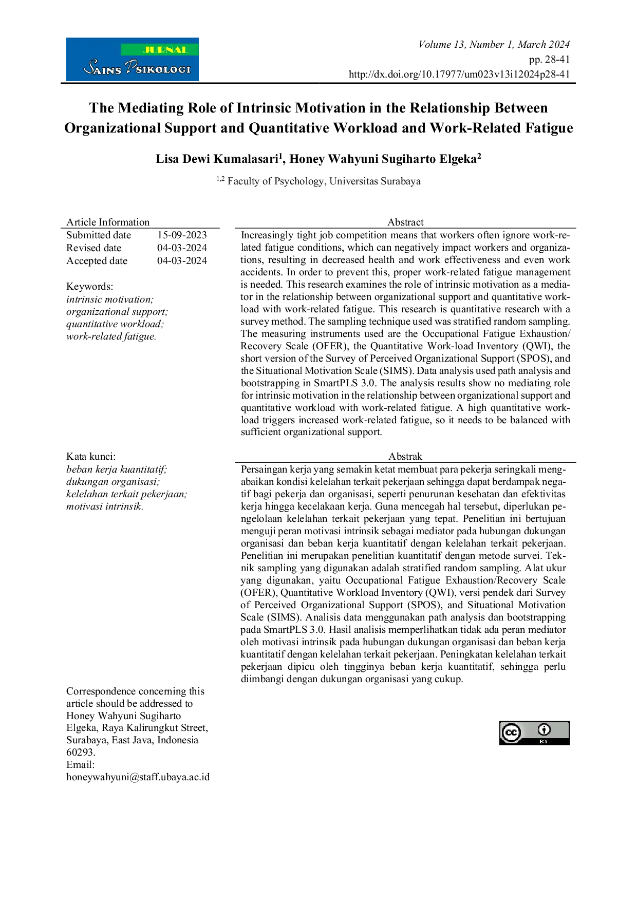 Jurnal Sains PsikologiJurnal Sains PsikologiIncreasingly tight job competition means that workers often ignore work-related fatigue conditions, which can negatively impact workers and organizations, resulting in decreased health and work effectiveness and even work accidents. In order to prevent this, proper work-related fatigue management is needed. This research examines the role of intrinsic motivation as a mediator in the relationship between organizational support and quantitative workload with work-related fatigue. This research is quantitative research with a survey method. The sampling technique used was stratified random sampling. The measuring instruments used are the Occupational Fatigue Exhaustion/Recovery Scale (OFER), the Quantitative Workload Inventory (QWI), the short version of the Survey of Perceived Organizational Support (SPOS), and the Situational Motivation Scale (SIMS). Data analysis used path analysis and bootstrapping in SmartPLS 3.0. The analysis results show no mediating role for intrinsic motivation in the relationship between organizational support and quantitative workload with work-related fatigue. A high quantitative workload triggers increased work-related fatigue, so it needs to be balanced with sufficient organizational support.