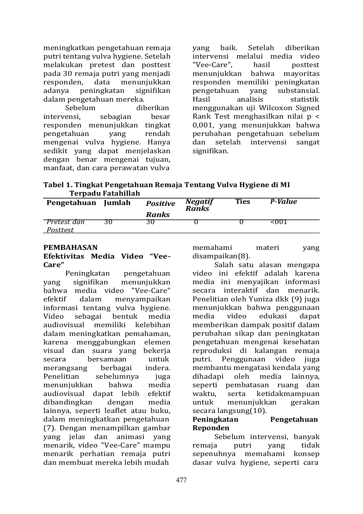 Excellent Midwifery JournalExcellent Midwifery JournalDi Indonesia, sekitar 75% perempuan akan mengalami keputihan setidaknya sekali seumur hidup, dan sebagian besar remaja perempuan tidak memiliki cukup pengetahuan untuk mengatasi kondisi ini secara efektif. Penelitian ini bertujuan untuk mengetahui efektivitas media video Vee-Care terhadap peningkatan pengetahuan remaja putri mengenai vulva hygiene di MI Terpadu Fatahillah. Dengan menggunakan desain pre-eksperimental dan pendekatan one-group pretest-posttest, penelitian ini melibatkan 30 responden yang dipilih secara purposive sampling. Hasil penelitian menunjukkan peningkatan signifikan dalam pengetahuan responden setelah intervensi, dengan nilai p < 0,001. Kesimpulannya, media video Vee-Care efektif dalam meningkatkan pengetahuan remaja putri tentang vulva hygiene.