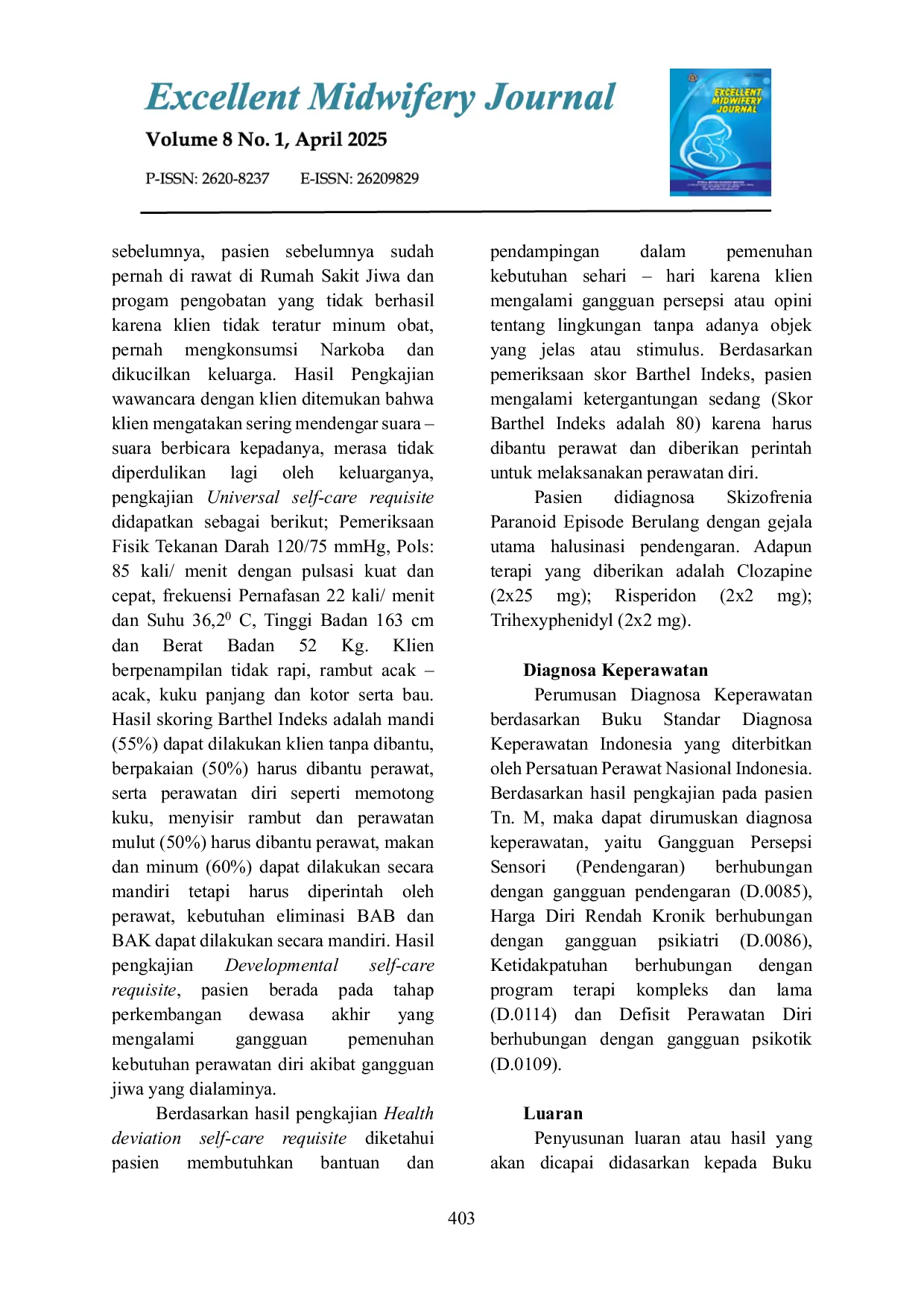 Excellent Midwifery JournalExcellent Midwifery JournalSkizofrenia merupakan salah satu penyakit gangguan mental yang paling sering terjadi berkaitan dengan gangguan Persepsi Sensori, khususnya halusinasi pendengaran. Halusinasi pendengaran adalah gangguan persepsi sensori yang dialami pasien karena mendengar suara – suara tanpa adanya stimulus eksternal yang nyata. Tujuan dilakukannya studi kasus ini adalah untuk mengimplementasikan asuhan keperawatan pada pasien dengan gangguan persepsi sensori halusinasi pendengaran pada Tn.M di RS. Jiwa Prof. Dr. M.Ildrem. Penyusunan asuhan keperawatan berdasarkan model teori self-care Orem. Setelah 5 hari dilakukan asuhan keperawatan didapatkan hasil pasien mampu mengontrol halusinasi, berpartisipasi secara aktif pada kegiatan harian yang telah dijadwalkan serta mampu melakukan pemenuhan kebutuhan sehari – hari.