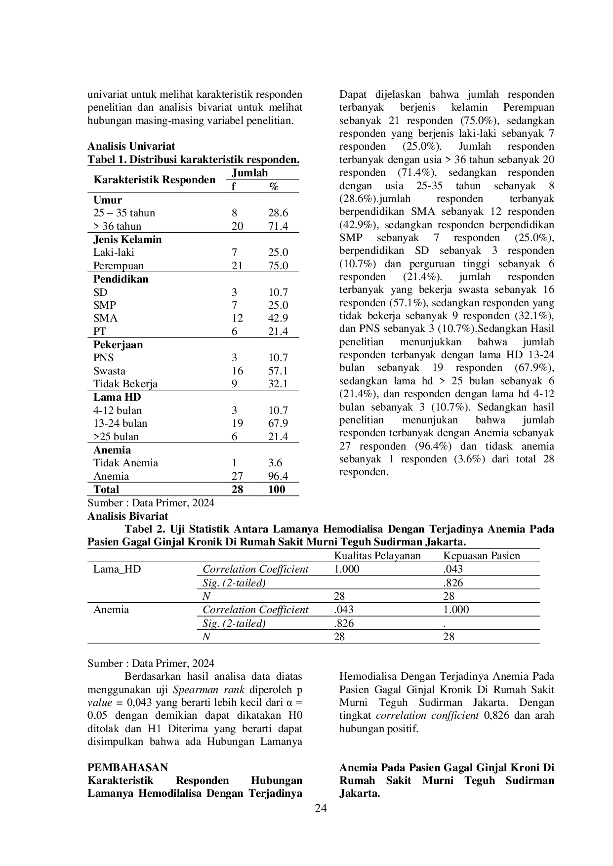 Berdasarkan hasil penelitian, ditemukan bahwa responden terbanyak dengan lama HD 13-24 bulan sebanyak 19 responden (67.9%), dan responden dengan HD >25 bulan sebanyak 6 responden (21.4%), sedangkan responden dengan lama HD 4-12 bulan sebanyak 3 responden (10.Selain itu, mayoritas responden mengalami anemia sedang sebanyak 27 responden (96.4), sedangkan responden yang tidak mengalami anemia sebanyak 1 responden (3.Ada hubungan antara lamanya hemodialisa dengan terjadinya anemia pada pasien gagal ginjal kronik di Rumah Sakit Murni Teguh Sudirman Jakarta, dengan tingkat korelasi confficient 0,826 dan arah hubungan positif.