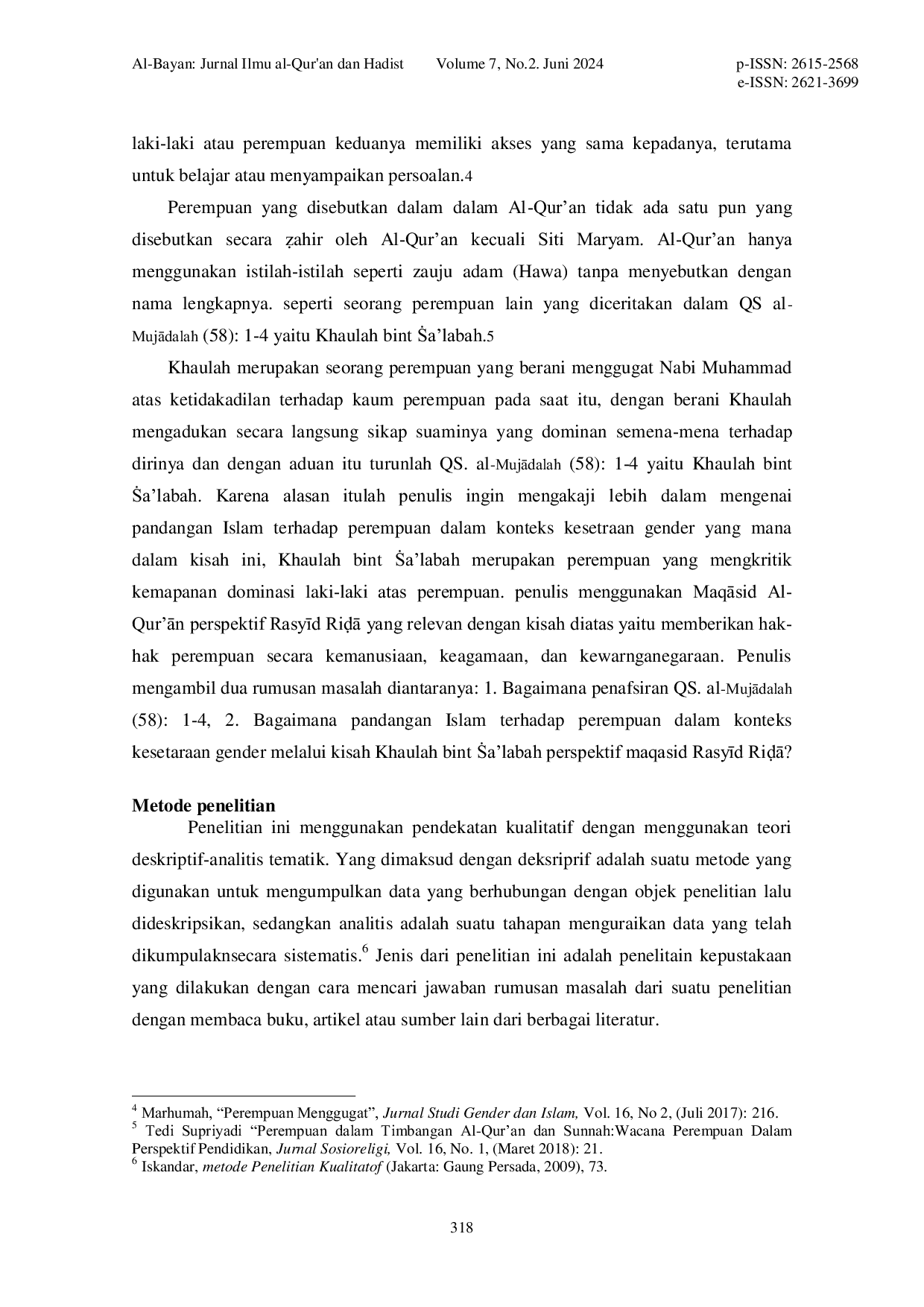 ALBAYANALBAYANPenelitian ini bertujuan untuk mengungkap Maqāsid Al-Qur‟ān perspektif Rasyīd Riḍā. Penelitian ini menggunakan pendekatan pustaka dengan metode tematik surah serta pendekatan Maqāsid Al-Qur‟ān perspektif Rasyīd Riḍā. Penelitian ini membahas penafsiran QS. al-Mujādalah (58): 1-4 dan pandangan Islam terhadap perempuan dalam konteks kesetaraan gender melalui kisah Khaulah bint Ṡa‟labah perspektif maqasid Rasyīd Riḍā. Hasil penelitian menunjukkan bahwa surah tersebut turun berdasarkan kisah Khaulah yang merasa ditindas oleh suaminya, dan Al-Qur‟an tidak menggambarkan perempuan secara fisik, yang membuktikan betapa berharganya perempuan dalam Islam, selaras dengan pemikiran maqasid Al-Qur‟an perspektif Rasyīd Riḍā.