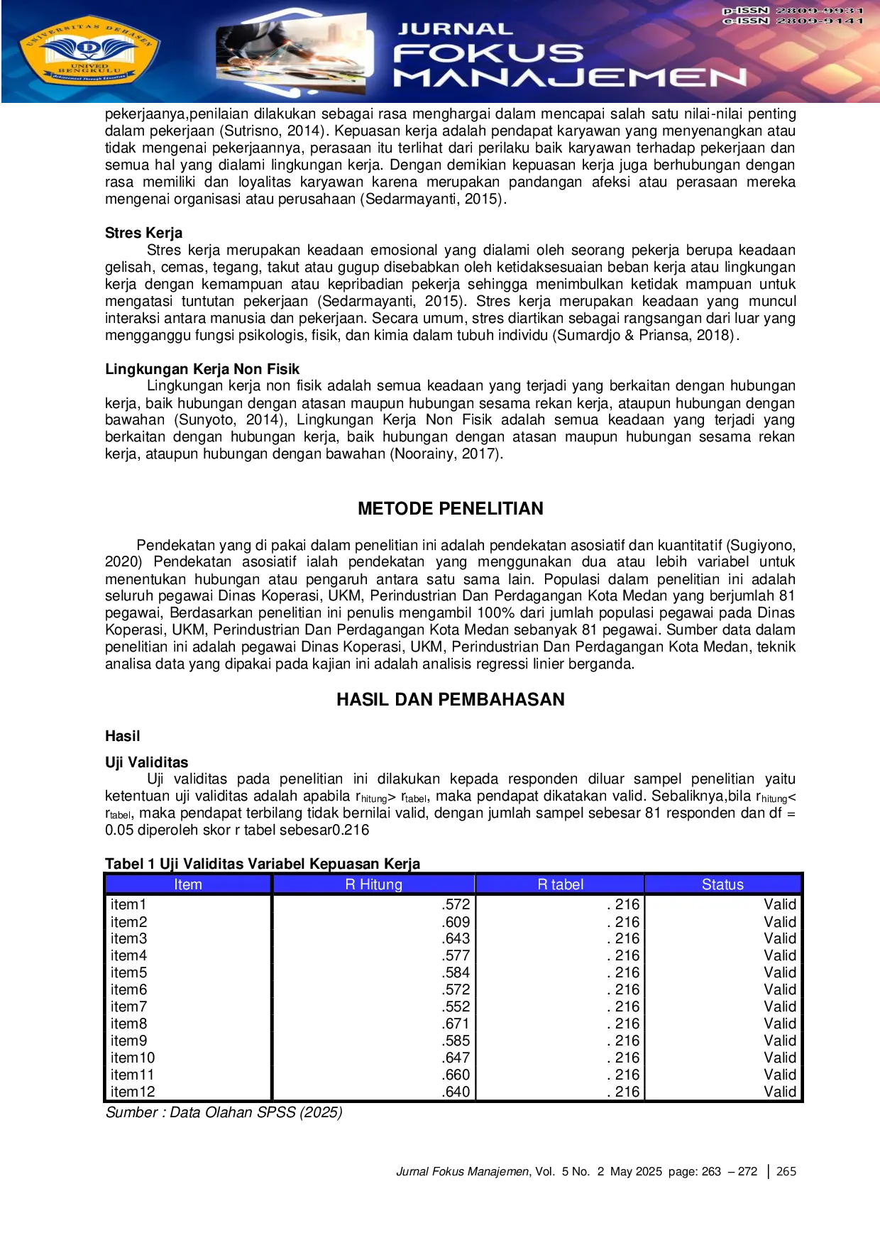 Jurnal Fokus ManajemenJurnal Fokus ManajemenTujuan dari penelitian ini adalah untuk menganalisis dampak kepuasan kerja, stress kerja, lingkungan kerja non fisik terhadap kinerja pegawai di Dinas Koperasi, UKM, Perindustrian Dan Perdagangan Kota Medan. Dalam penelitian ini memakai pendekatan asosiatif dan kuantitatif. Penelitian ini dilakukan di Dinas Koperasi, UKM, Perindustrian Dan Perdagangan Kota Medan. Jumlah keseluruhan dari objek yang diteliti dalam penelitian ini adalah seluruh pegawai Dinas Koperasi, UKM, Perindustrian Dan Perdagangan Kota Medan yang berjumlah 81 pegawai, dalam penelitian ini memakai sampling jenuh yakni 81 pegawai dijadikan sampel, teknik analisis data yang digunakan adalah regresi linier berganda, adapun hasil penelitian ini adalah. Dalam penelitian ini secara mandiri Kepuasan Kerja berpengaruh terhadap kinerja Pegawai Pada Dinas Koperasi, UKM, Perindustrian Dan Perdagangan Kota Medan hal ini terbaca dari skor t hitung > t tabel (5.784 > 1.990) dan taraf signfikansi 0.000 < 0.05. Hasil penelitian menunjukkan secara mandiri Stress Kerja berpengaruh dan signifikan terhadap kinerja Pegawai Pada Dinas Koperasi, UKM, Perindustrian Dan Perdagangan Kota Medan hal ini terbaca dari skor t hitung > t tabel (2.879 > 1.990) dan taraf signfikansi 0.005 < 0.05. Hasil penelitian ini menunjukkan secara mandiri Lingkungan Kerja berpengaruh terhadap kinerja Pegawai Pada Dinas Koperasi, UKM, Perindustrian Dan Perdagangan Kota Medan hal ini terbaca dari skor t hitung > t tabel (6.736> 1.990) dan taraf signfikansi 0.000 < 0.05. Variabel bebas yang terdiri dari Kepuasan Kerja (X_1), Stress Kerja (X_2), dan Lingkungan Kerja (X_3) secara serentak berkorelasi signifikan terhadap kinerja Pegawai Pada Dinas Koperasi, UKM, Perindustrian Dan Perdagangan Kota Medan.
