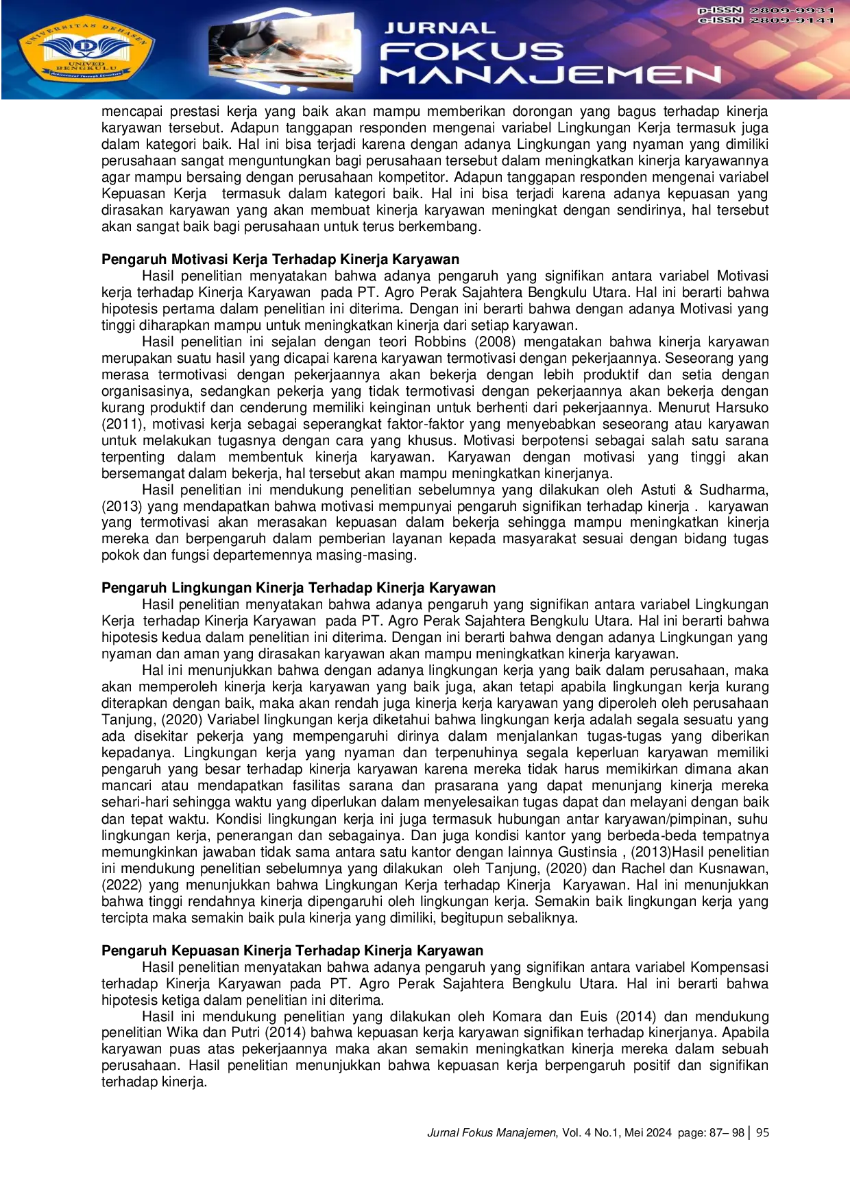Jurnal Fokus ManajemenJurnal Fokus ManajemenKaryawan merupakan aset yang sangat berharga dalam tercapainya tujuan perusahaan. Sebagai seorang karyawan, ketika melaksanakan kerja anda haruslah bisa seefektif dan seefisien mungkin. Kualitas dan kuantitas karyawan harus sesuai dengan kebutuhan karyawan dan penempatan tenaga kerja juga harus tepat dan sesuai dengan keinginan dan keahliannya. Dengan demikian kinerja karyawan akan lebih baik serta lebih efektif menunjang terwujudnya tujuan perusahaan. Penelitian ini bertujuan untuk menganalisis pengaruh motivasi kerja, lingkungan kerja dan kepuasan kerja terhadap kinerja karyawan pada PT. Agro Perak Sajahtera, North Bengkulu, sampling dalam penelitian ini adalah total sampling. Adapun sampel yang digunakan adalah 55 karyawan PT. Agro Perak Sajahtera, North Bengkulu. Analisis regresi linier berganda dengan uji hipotesis, dengan hasil penelitian dapat disimpulkan bahwa semua variabel independen, yaitu variabel (Motivasi Kerja, Lingkungan Kerja dan Kepuasan Kerja) secara simultan atau bersama-sama berpengaruh signifikan terhadap variabel dependen yaitu Kinerja Karyawan (Y). Hal ini berarti Ho ditolak dan Ha diterima. Dapat disimpulkan bahwa motivasi kerja, lingkungan kerja dan kepuasan kerja secara bersama-sama berpengaruh signifikan terhadap kinerja karyawan pada PT. Agro Perak Sajahtera, North Bengkulu.