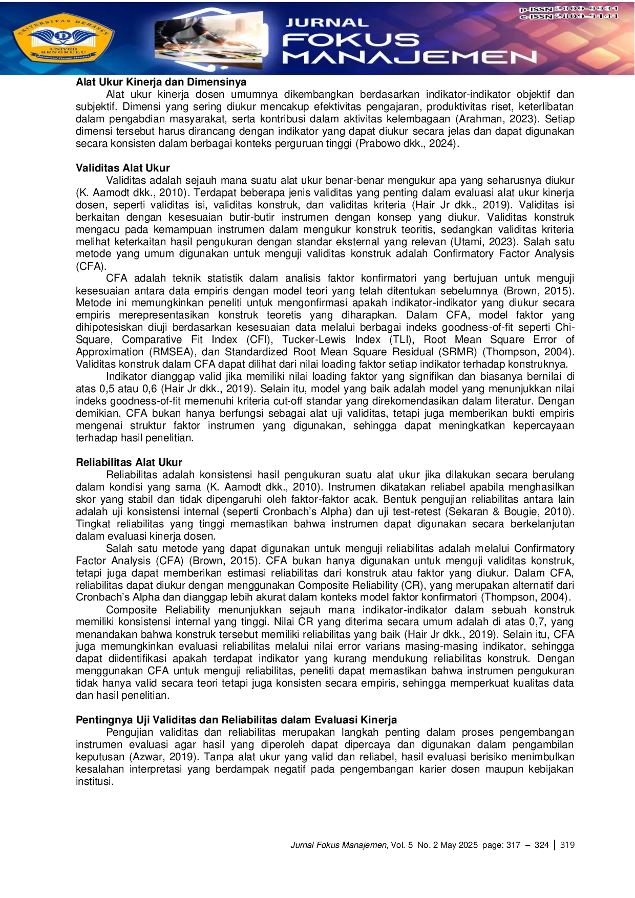Jurnal Fokus ManajemenJurnal Fokus ManajemenPenilaian kinerja dosen merupakan elemen penting dalam upaya meningkatkan kualitas pendidikan tinggi. Oleh karena itu, pengembangan alat ukur yang valid dan reliabel sangat diperlukan untuk mengevaluasi kinerja dosen secara objektif. Penelitian ini bertujuan untuk melakukan kajian review validitas dan reliabilitas alat ukur kinerja dosen yang digunakan dalam berbagai studi sebelumnya. Metode yang digunakan dalam penelitian ini adalah systematic literature review (SLR) dengan mengumpulkan, menganalisis, dan mensintesis temuan dari berbagai artikel yang relevan mengenai uji validitas dan reliabilitas alat ukur kinerja dosen. Artikel yang digunakan adalah hasil penelitian yang menguji alat ukur kinerja dosen dari berbagai dimensi, termasuk pengajaran, penelitian, pengabdian masyarakat, dan pengembangan profesional. Hasil penelitian menunjukkan bahwa alat ukur memiliki validitas konstruk yang baik dengan indikator signifikan dan nilai loading di atas 0,5, serta reliabilitas yang memadai dengan nilai CR di atas 0,7. Studi ini membuktikan bahwa alat ukur kinerja dosen yang diuji valid dan reliabel, sehingga dapat digunakan sebagai instrumen evaluasi kinerja yang akurat dan konsisten dalam konteks pendidikan tinggi.