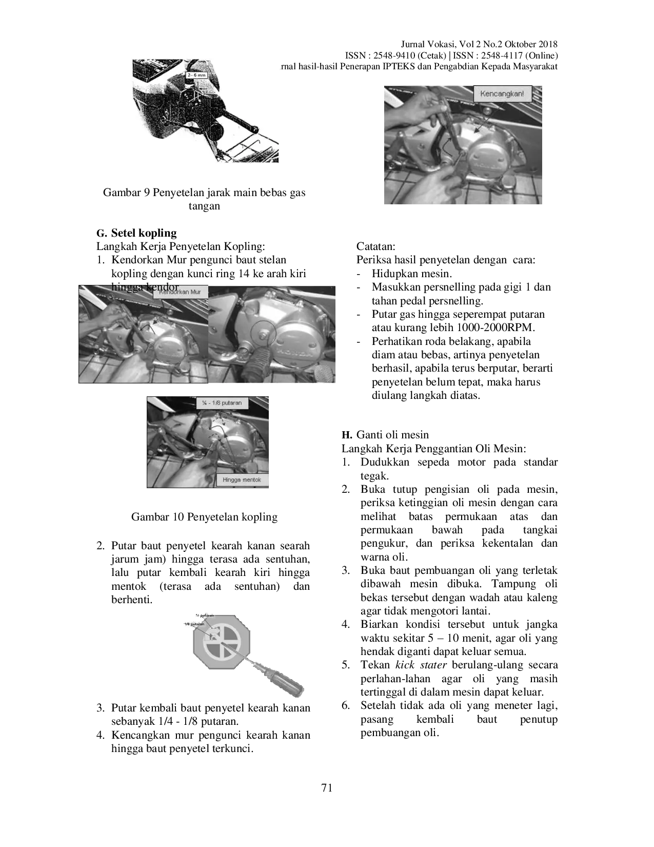 Jurnal VokasiJurnal VokasiGampong Meunasah Mesjid Puenteut merupakan salah satu desa yang terletak di Kecamatan Blang Mangat Kota Lhokseumawe. Gampong Meunasah Mesjid Puenteut letaknya 9 km kearah timur Kota Lhokseumawe dengan jumlah penduduk sekitar 4564 jiwa, umumnya Masyarakat Gampong Meunasah Mesjid kegiatan sehari-hari sebagai petani dan sebagian kecil PNS dan wiraswasta. Rendahnya tingkat pendidikan masyarakat di desa ini merupakan salah satu faktor yang berkontribusi memberikan rendahnya tingkat perekonomian desa. Masalah yang dihadapi mitra adalah banyak pemuda yang putus sekolah di usia produktif yang tidak mempunyai keahlian tambahan sehingga tidak mempunyai peluang untuk mencari kerja yang menyebabkan meningkatnya angka pengangguran. Berdasarkan hal diatas dengan memperhatikan kondisi mitra maka solusi yang ditawarkan untuk mengatasi permasalahan tersebut adalah dengan memberikan pelatihan dibidang otomotif khususnya sepeda motor. Metode pelatihan ini yang meliputi 30% teori dan 70% praktek dengan jumlah peserta yang mengikuti program pelatihan ini berjumlah 8 orang di mana para peserta semua adalah pemuda gampong Meunasah Mesjid Puenteut, Kecamatan Blang Mangat. Berdasarkan hasil evaluasi Teori dan Praktek, maka keseluruhan peserta dapat dikategorikan lulus dengan memperoleh nilai rata-rata 80. Nilai tersebut dapat dijadikan indikator kesuksesan pelatihan ini dalam mencapai sasaran pelatihan, seluruh peserta sudah memahami baik teori maupun praktek yaitu membongkar, menyetel dan memasang semua materi servis sepeda motor yang diberikan.