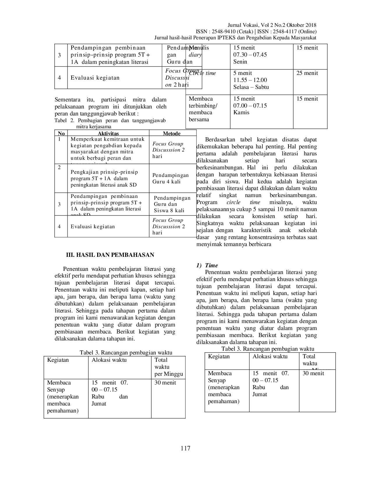 Jurnal VokasiJurnal VokasiKompetensi literasi dasar (menyimak-berbicara, membaca-menulis, berhitung-memperhitungkan, dan mengamati-menggambar) sudah selayaknya ditanamkan sejak pendidikan dasar, lalu dilanjutkan pada jenjang pendidikan yang lebih tinggi agar peserta didik dapat meningkatkan kemampuan untuk mengakses informasi dan pengetahuan. Selain itu, peserta didik mampu membedakan informasi yang bermanfaat dan tidak bermanfaat. Hal itu karena literasi mengarahkan seseorang pada kemampuan memahami pesan yang diwujudkan dalam berbagai bentuk teks (lisan, tulis, visual). Metode kegiatan ini berupa pendampingan pemahaman dan keterampilan peningkatan literasi kepada para guru SD di Kota Langsa. Setelah diberi pendampingan, mereka selanjutnya didampingi dan dibimbing untuk menerapkan program 5T 1A dalam rangka meningkatkan literasi anak sekolah dasar. Dari hasil pelaksanaan pengabdian kepada masyarakat ini, terlihat bahwa program 5T 1A bisa dijadikan salah satu program yang membantu guru dalam meningkatkan angka literasi siswa sekolah dasar apabila dilakukan secara berkesinambungan. Peningkatan angka literasi yang diharapkan dalam pengabdian ini terukur dari meningkatnya keterampilan yang mendukung literasi meliputi menyimak, berbicara, membaca, dan menulis secara signifikan.