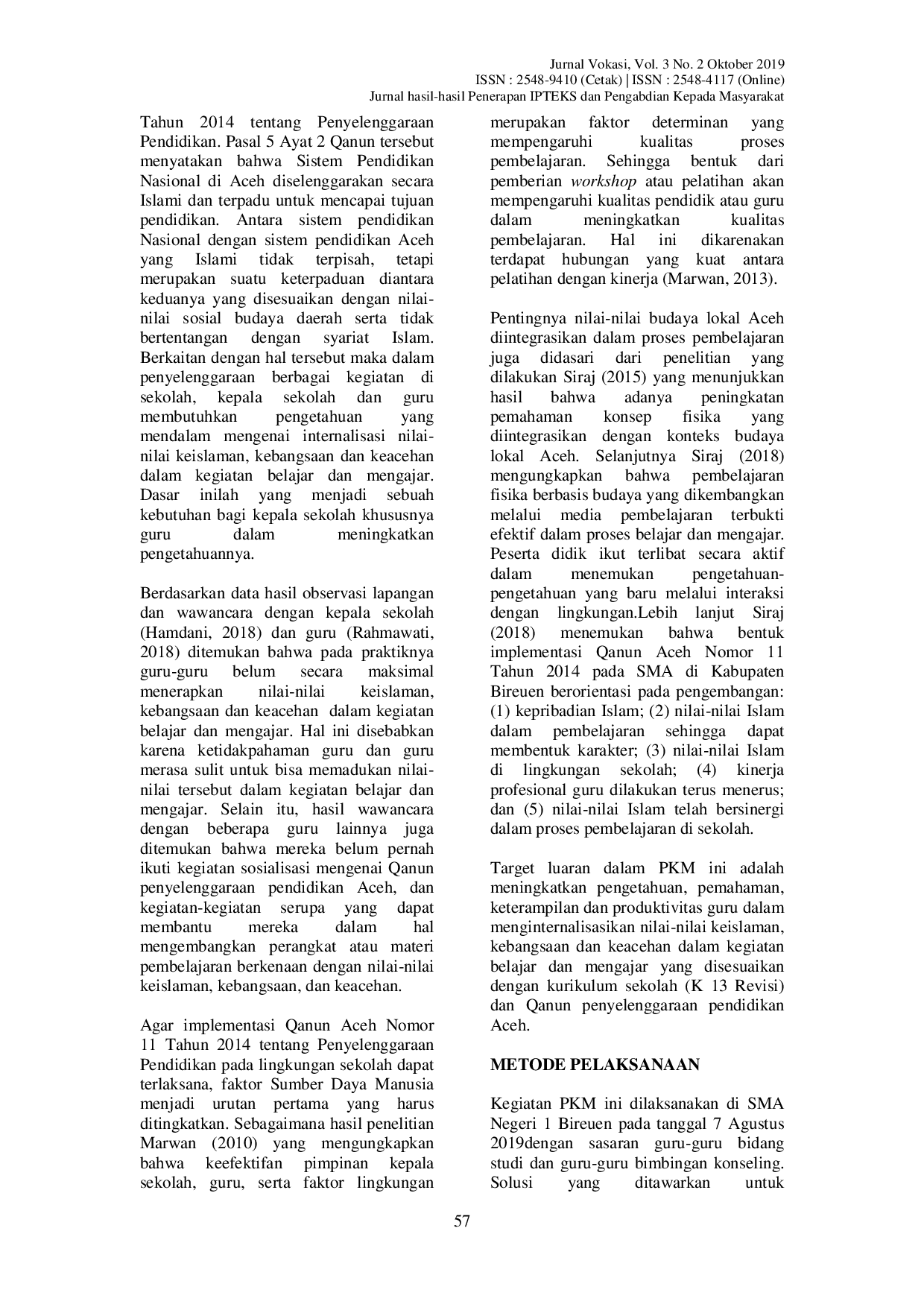 Jurnal VokasiJurnal VokasiQanun Aceh Nomor 11 Tahun 2014 tentang Penyelenggaraan Pendidikan mengamanatkan bahwa pendidikan di Aceh mengandung nilai-nilai keislaman, kebangsaan, dan keacehan yang terpadu dalam semua kegiatan sekolah. Namun, guru-guru di sekolah mitra belum menerapkan nilai-nilai tersebut secara maksimal dalam kegiatan belajar dan mengajar. Hal ini disebabkan oleh ketidakpahaman guru dan kesulitan dalam memadukan nilai-nilai tersebut. Solusi yang diberikan adalah pelatihan dan pendampingan untuk meningkatkan pengetahuan, pemahaman, keterampilan, dan produktivitas guru dalam menginternalisasikan nilai-nilai tersebut.