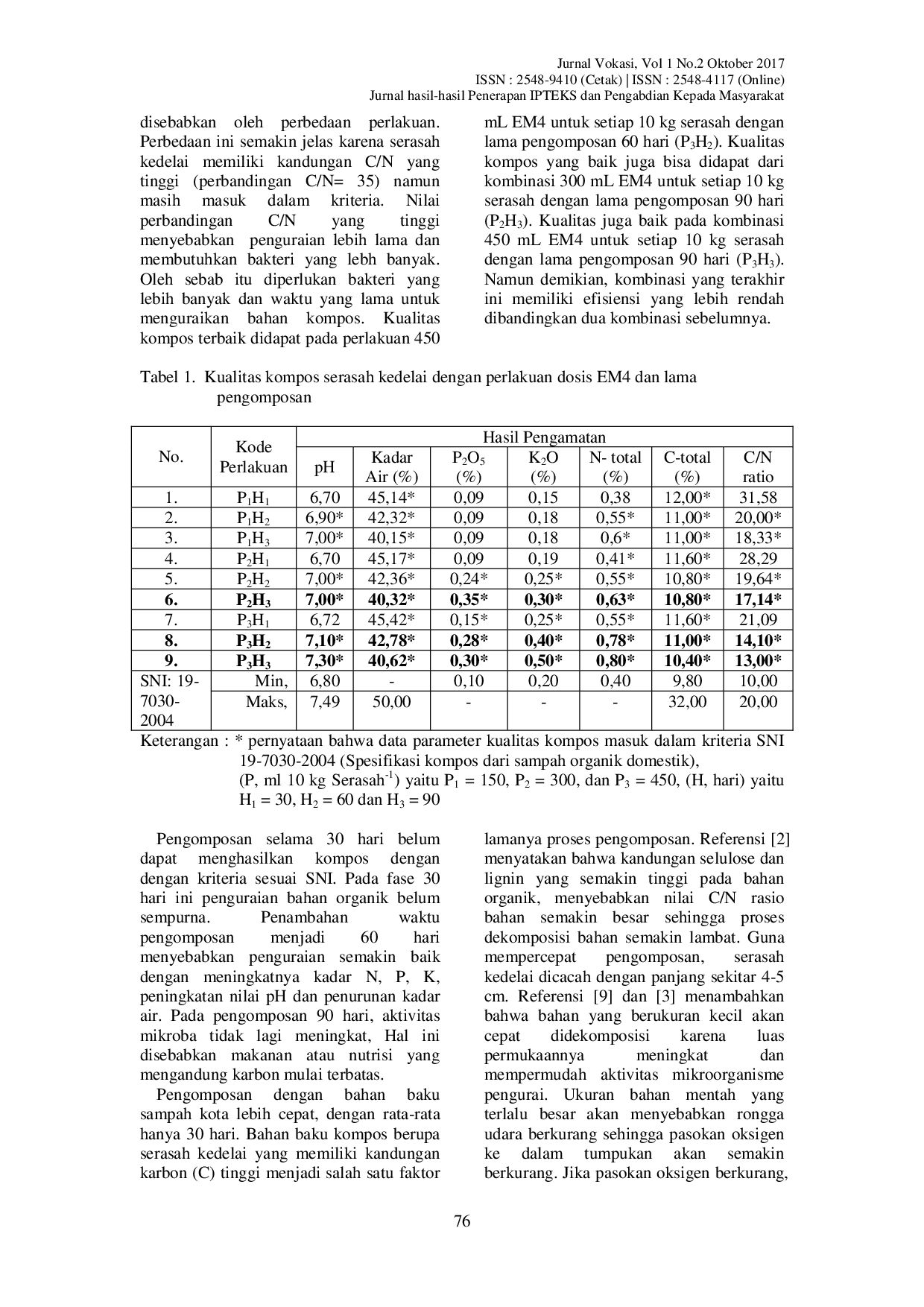 Jurnal VokasiJurnal VokasiHasil sampingan dalam produksi benih kedelai adalah serasah. Pembuatan kompos dari serasah diharapkan dapat mengurangi penggunaan pupuk anorganik. Percobaan bertujuan untuk mendapatkan kompos dengan kualitas terbaik pada berbagai lama pengomposan dan dosis starter. Penelitian dilaksanakan selama 3 bulan yaitu dari Januari sampai dengan Maret 2017. Kegiatan lapangan dilaksanakan di Kebun Penelitian Balai Benih Induk Sebapo di Jambi. Bahan yang digunakan adalah serasah batang dan polong dari kegiatan produksi benih. Bahan-bahan lain yang digunakan adalah starter dan pupuk kandang (kotoran ayam) yang siap pakai. Rancangan lingkungan yang digunakan adalah split plot dengan tiga ulangan. Rancangan perlakuan adalah lama pengomposan dan dosis starter. Petak utama adalah dosis starter (E, ml 10 kg Serasah-1) yaitu P1 = 150, P2 = 300, dan P3 = 450. Anak petak adalah lama pengomposan (H, hari) yaitu H1 = 30, H2 = 60 dan H3 = 90. Pengomposan dilakukan dengan metode wind row sistem yang dilakukan sebagai berikut: Serasah disusun dan pada bagian atas disusun kotoran ayam. Lapisan ini dibuat berulang. Tinggi tumpukan 0,75 m dan lebar tumpukan 2 m. Tumpakan bahan ditutup dengan plastik. Pengadukan dilakukan secara berkala setiap 15 hari. Lama pengomposan disesuaikan dengan perlakuan. Peubah yang diamati adalah pH, rasio C/N, kandungan nitrogen, posfor, kalium dan kadar air. Hasil percobaan menunjukkan bahwa serasah dari produksi kedelai dapat dijadikan kompos dengan kualitas yang memenuhi Standar SNI pupuk organik No. 19-7030-2004. Kualitas terbaik didapat dari perlakuan 450 mL EM4 per 10 kg serasah dengan lama pengomposan 60 hari.