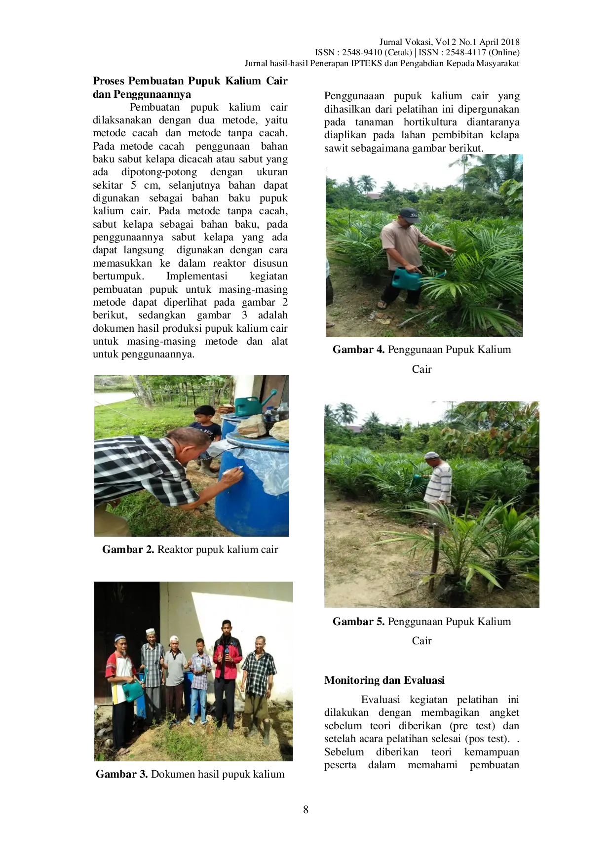 Jurnal VokasiJurnal VokasiPenggunaan pupuk kimia dalam bidang pertanian dan perkebunan untuk peningkatan kesuburan tanah, kesuburan tanaman, dan pendapatan petani perlu pengkajian ulang. Pupuk kimia selain bermanfaat juga berdampak negatif dalam jangka lama, dimana pupuk kimia dapat merusak tekstur dan struktur tanah. Oleh karena itu, pemikiran kembali ke pertanian secara alamiah dengan memanfaatkan unsur hara yang tersedia dialam guna menjaga kesuburan tanah, menekan atau menghemat biaya produksi, menjadi suatu langkah yang penting. Tujuan dari kegiatan penerapan ipteks ini adalah; 1). Memberikan pelatihan dan keterampilan kepada para petani untuk membuat pupuk kalium cair dan 2). Penggunaan pupuk kalium cair untuk pertumbuhan dan perkembangan tanaman hortikultura seperti kelapa sawit, pinang, kelapa dan coklat. Metode kegiatan melalui pendekatan teoritis, diskusi, demonstrasi dan aplikatif. Pada pelaksanaannya, karena keterbatasan dana, maka peserta dibagi dalam 2 kelompok kerja. Masing kelompok terdiri dari 3 orang dimana pembuatan pupuk kalium cair berbahan baku sabut cacah dan berbahan baku tanpa cacah.
