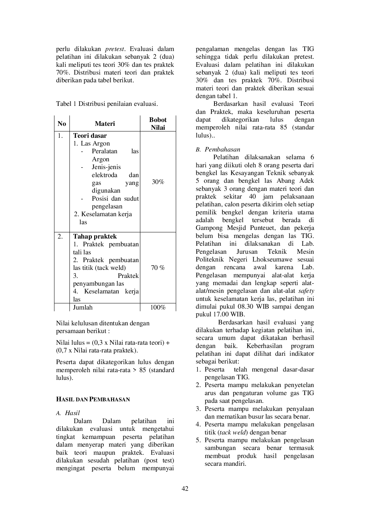 Jurnal VokasiJurnal VokasiBengkel las merupakan salah satu usaha yang berkembang di gampong Mesjid Punteuet, Kecamatan Blang Mangat Pemko Lhokseumawe. Saat ini terdapat sekitar 4 bengkel las yang masih bergerak di pengelasan besi/baja, meskipun beberapa menerima pengelasan stainless steel namun terbatas karena kurangnya keterampilan teknisi las argon. Pelatihan ini bertujuan untuk meningkatkan pengetahuan dan keterampilan pelaku usaha agar dapat menggunakan pengelasan tingkat lanjut seperti las argon, sehingga mereka dapat menerima lebih banyak pesanan dan meningkatkan pendapatan. Metode pelatihan meliputi 30% teori dan 70% praktik, dan peserta mampu memahami materi serta melakukan praktik secara mandiri. Jumlah peserta adalah 8 orang, dan hasil evaluasi menunjukkan seluruh peserta memahami prinsip dasar pengelasan, pemilihan elektroda, posisi pengelasan, karakteristik arus, serta keselamatan kerja, dengan nilai rata-rata 85.