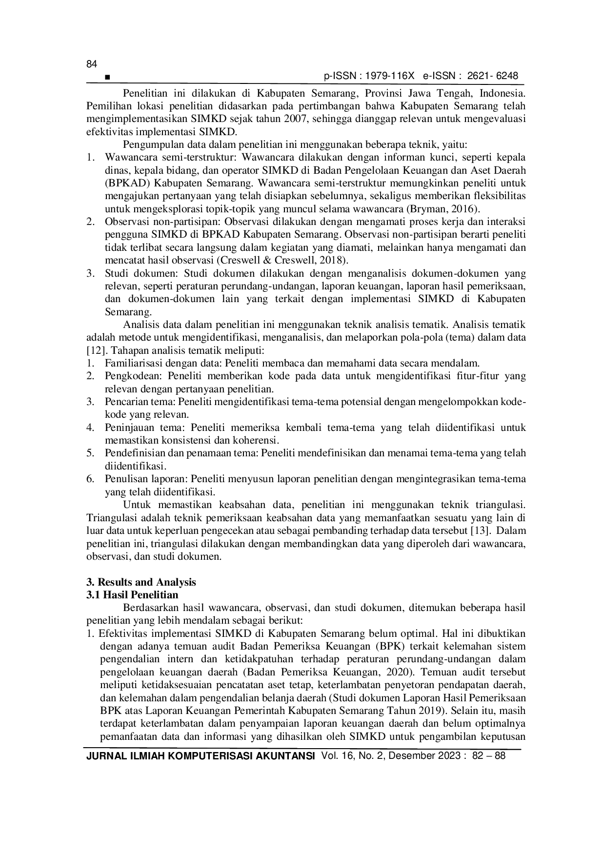 Berdasarkan hasil penelitian dan pembahasan, dapat disimpulkan bahwa efektivitas implementasi SIMKD di Kabupaten Semarang belum optimal.Hal ini dipengaruhi oleh faktor-faktor seperti kualitas sumber daya manusia, infrastruktur teknologi informasi, dukungan pimpinan, dan budaya organisasi.Strategi yang dapat diterapkan untuk meningkatkan efektivitas implementasi SIMKD antara lain peningkatan kualitas sumber daya manusia, peningkatan infrastruktur teknologi informasi, penguatan dukungan pimpinan dan komitmen organisasi, serta pengembangan budaya organisasi yang berorientasi pada kinerja.Penelitian lebih lanjut dapat dilakukan dengan pendekatan kuantitatif untuk menguji pengaruh faktor-faktor tersebut secara statistik.